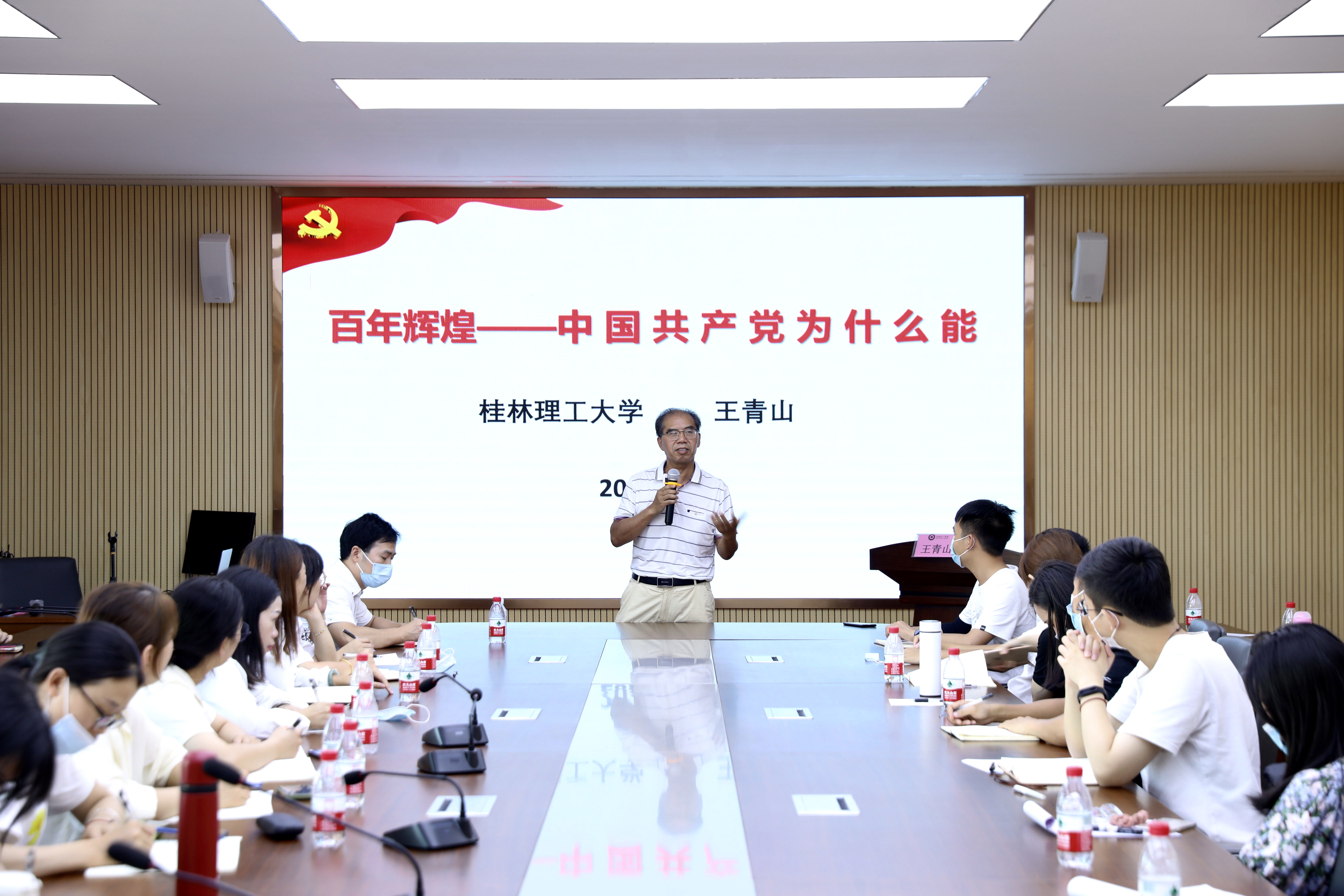 8月30日下午,我校2021年辅导员“1+1”培训班第七讲课程特邀请到了桂林理工大学王青山教授为全体辅导员培训班做了题为《百年辉煌—中国共产党为什么能》的专题培训。