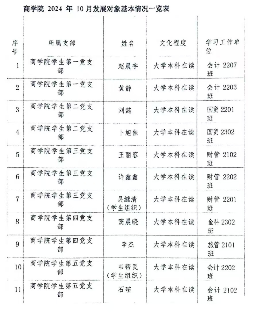 经支部大会、党总支研究同意,将赵晨宇等11位同志列为发展对象人选。根据发展党员工作有关要求,现将其有关情况公示。公示时间为2024年10月1日至10月8日(公示期5个工作日)。