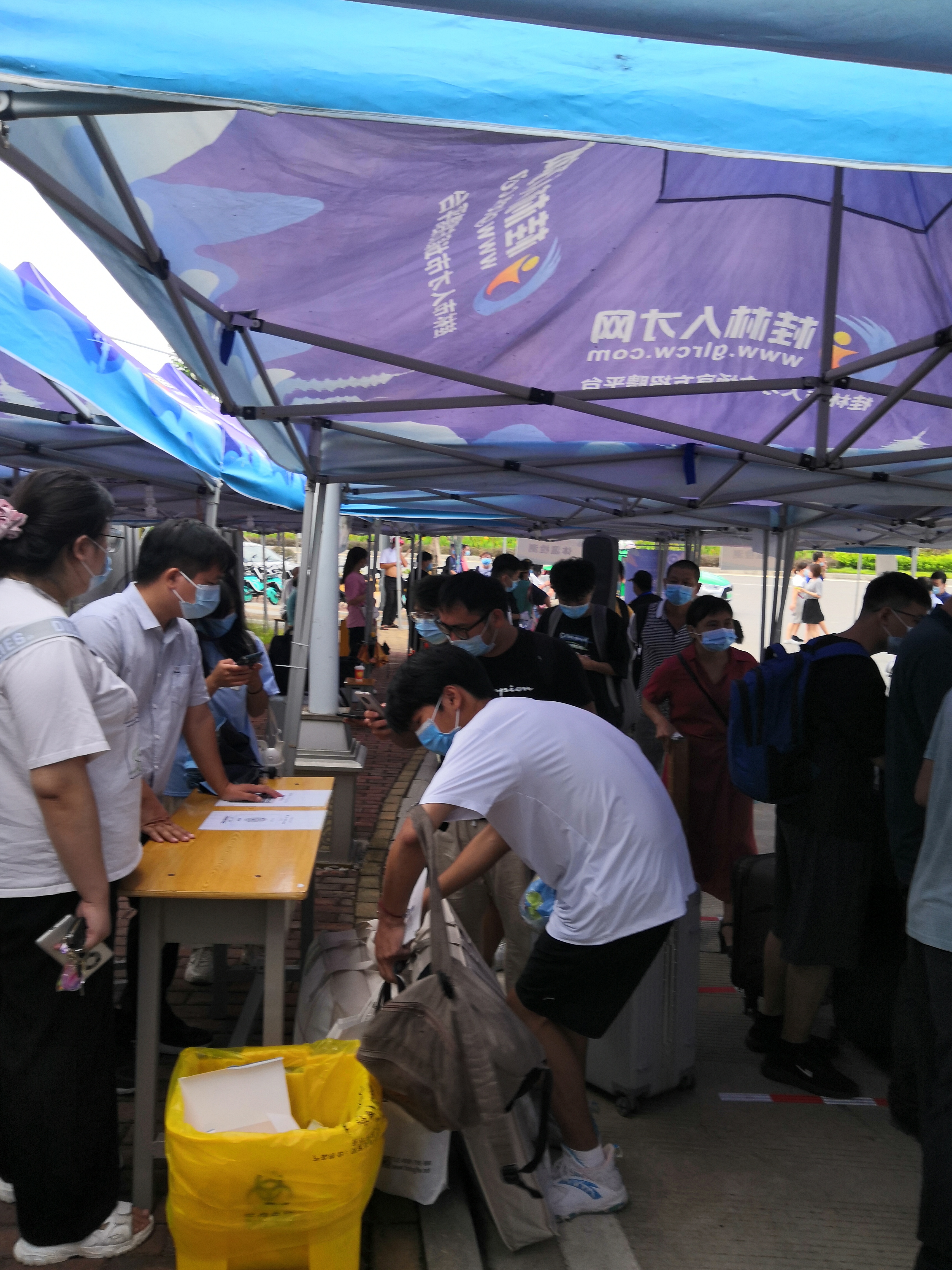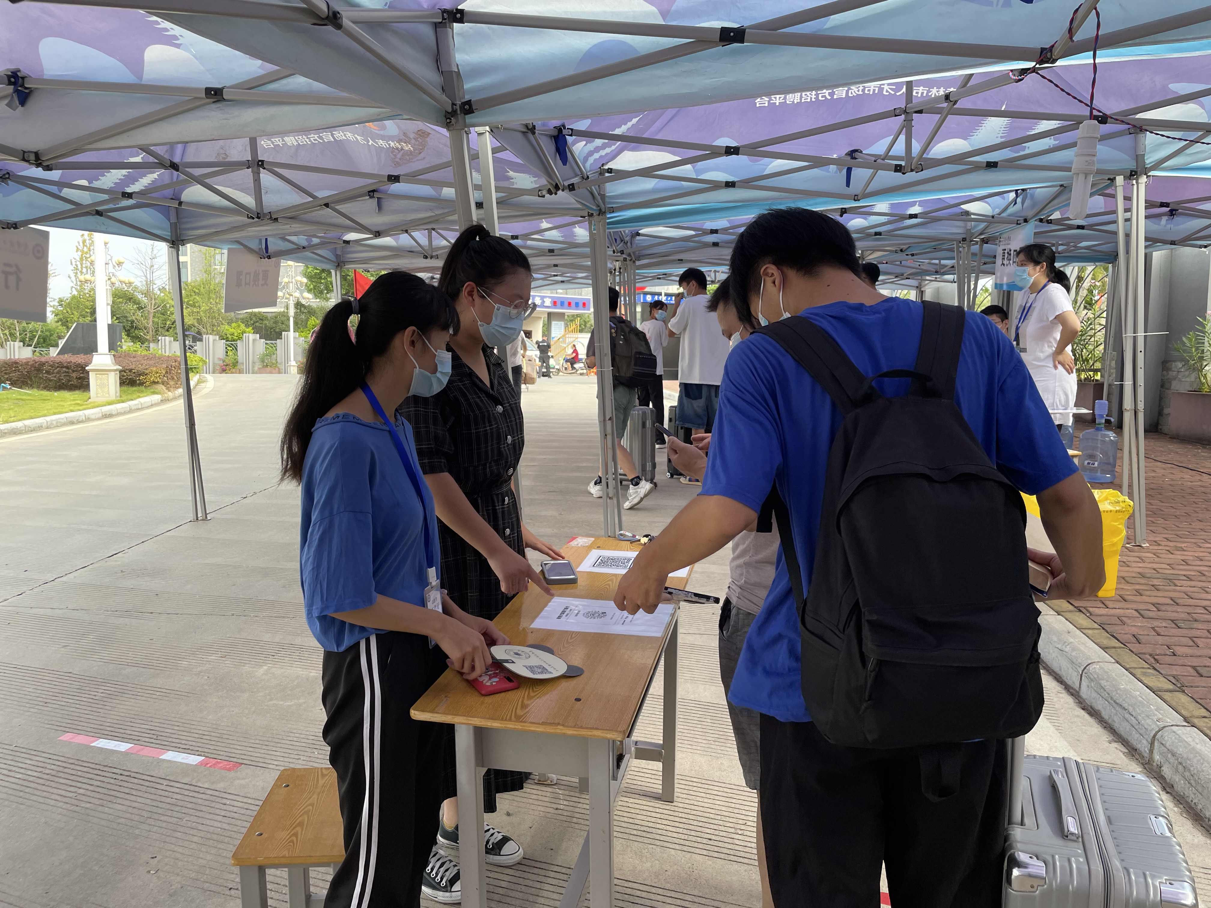在开学当天,每一位学生入校前需要依次进行“一测二核三查四消”的检查流程,我院学工系统全体辅导员联合后勤保卫处在校门口轮岗值班,做好体温监测、消毒工作,核查同学们的48小时内核酸检测报告、健康码和钉钉信息,整个过程严谨而有序。