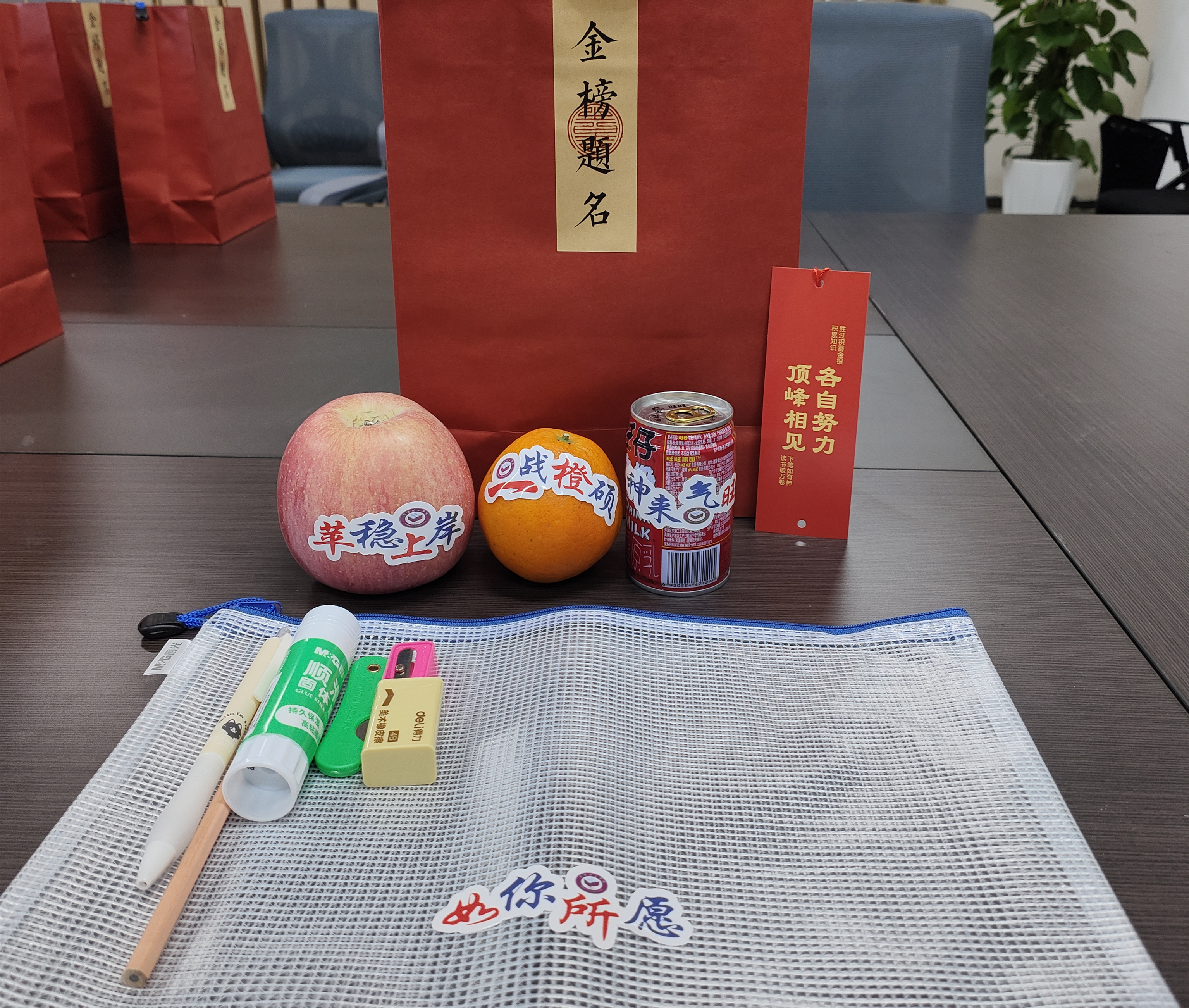 毕业班辅导员们为考研学子们发放学院定制的“考研加油包”,“加油包”内有考研文具袋、象征着“橙”功上岸的脐橙及“苹”稳上岸的苹果,都饱含了学院对考生们满满的祝福与期待,表达了学院的关怀和美好祝福。收到“考研加油包”后,考研学子们纷纷表示,“加油包”心意满满,在接下来的冲刺关头,将积极备考,调整心态,千“研”万语,终究会一“研”为定。