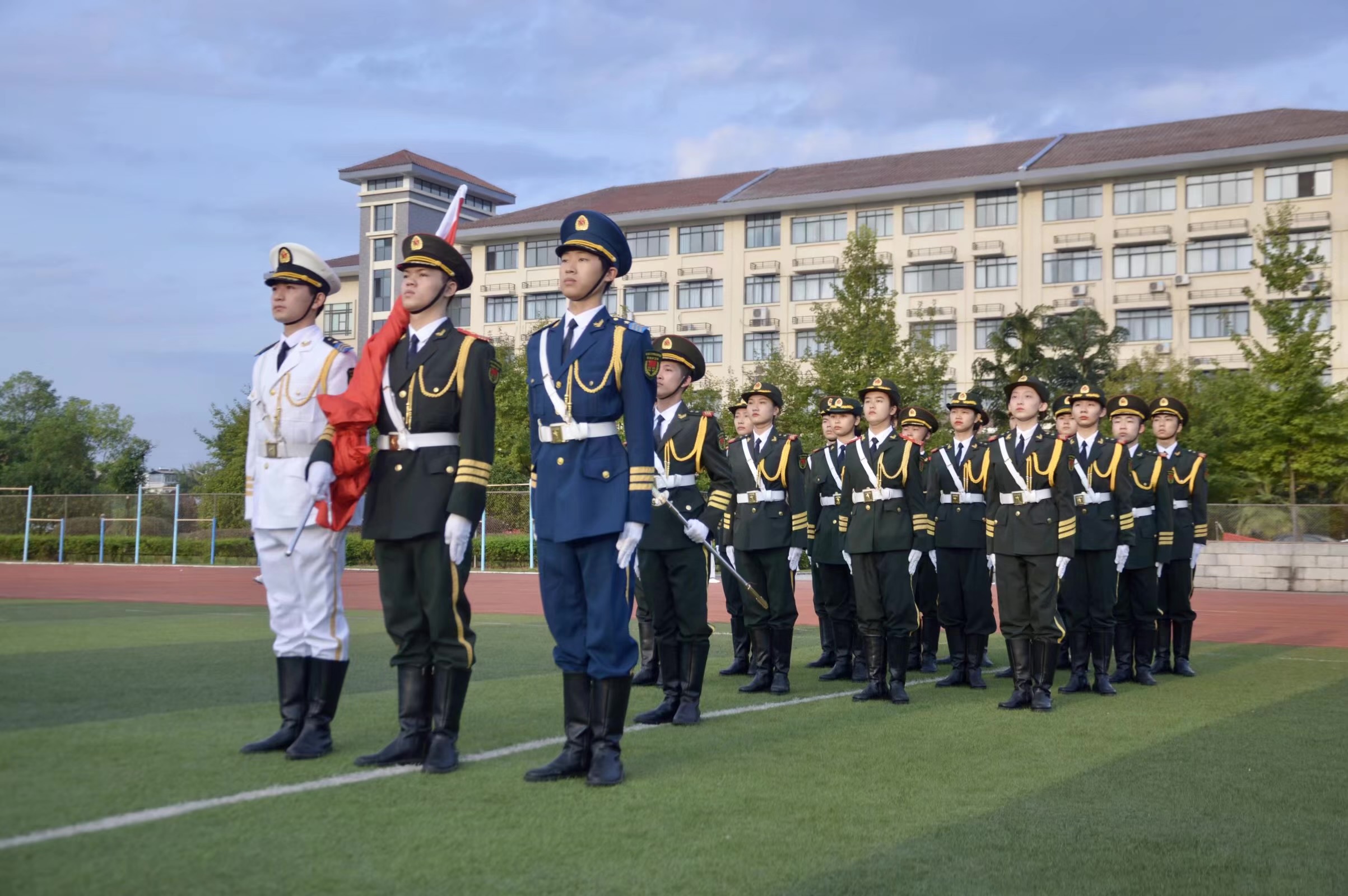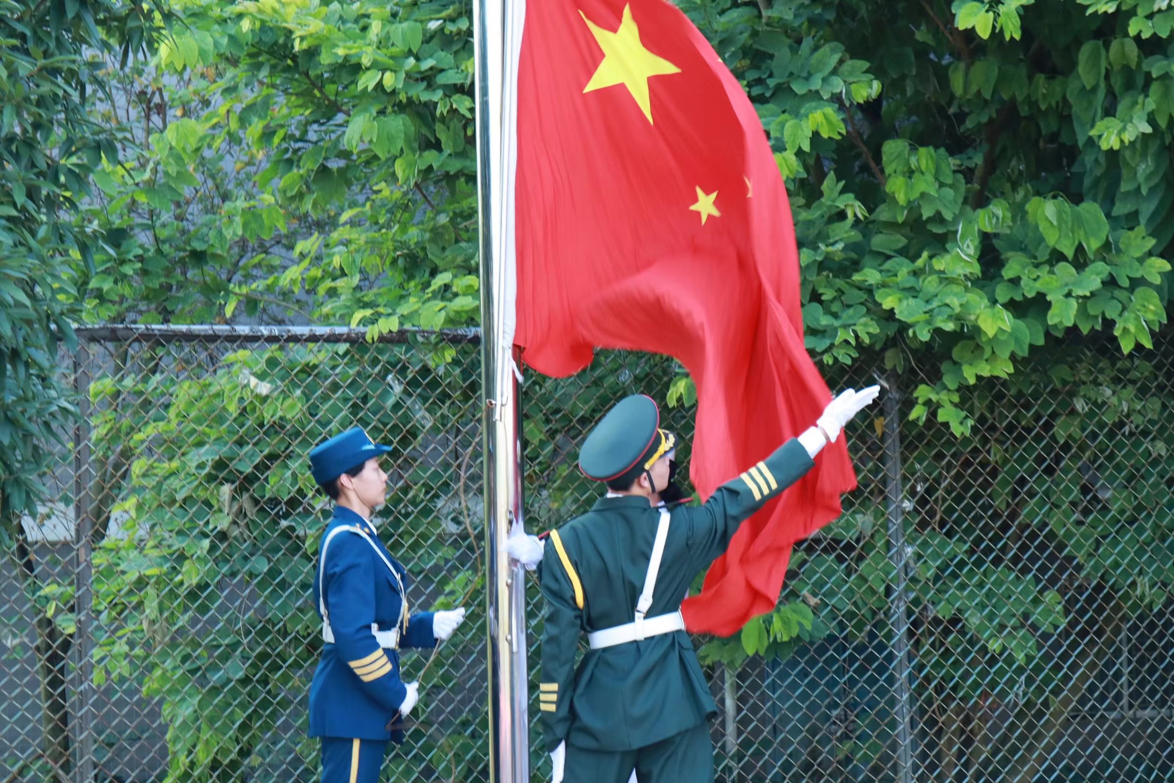 迎着朝阳,国旗班成员们迈着坚定有力的步伐,庄严地护送五星红旗正步走向旗杆。他们着装整齐、步伐稳健,用赤子之心与铁血毅力展示了国旗风采。伴随着雄壮有力的《义勇军进行曲》,鲜艳的五星红旗冉冉升起,迎风飘扬。现场全体师生高唱国歌、肃立行注目礼,为伟大祖国送上最诚挚的祝福。