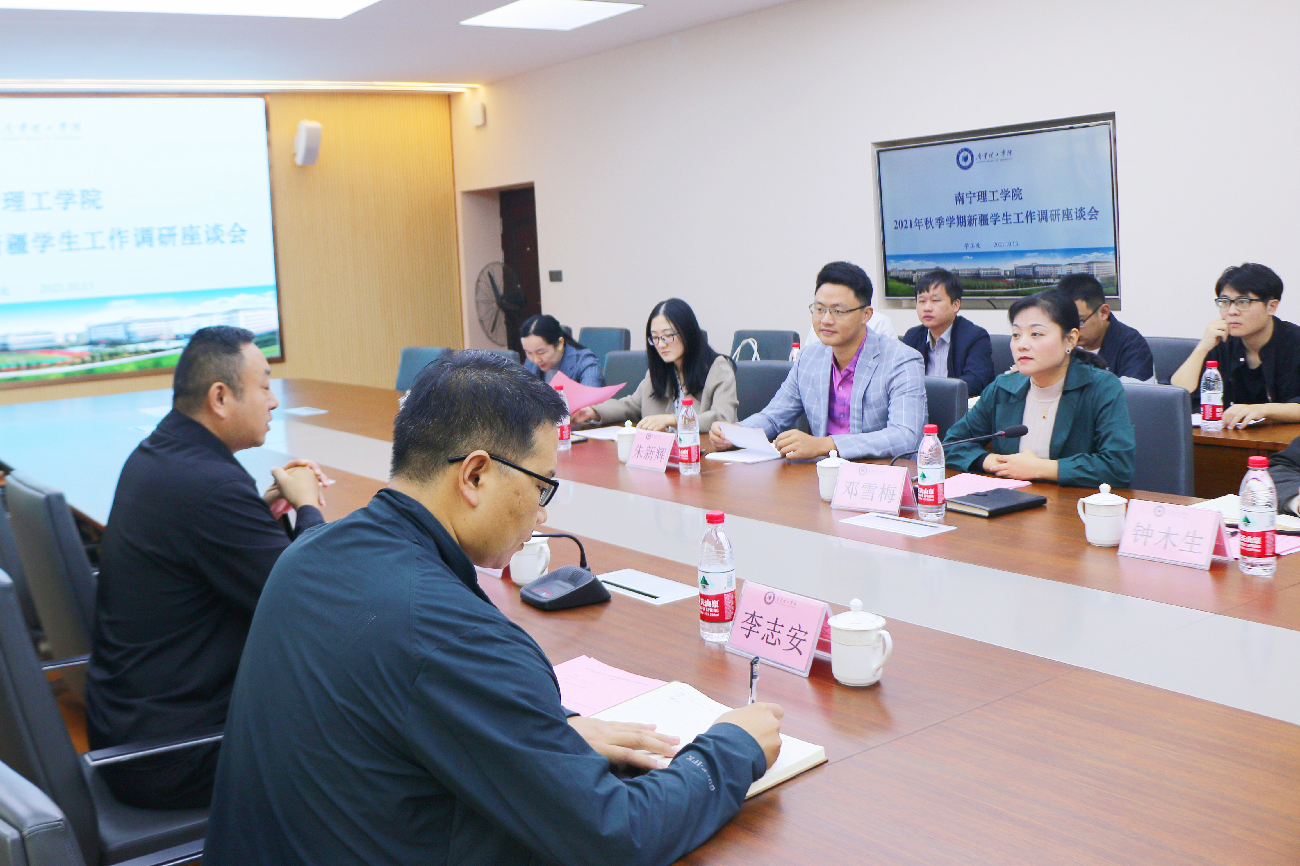 此次座谈会首先由自治区教育厅思政处副处长、新疆驻广西教育协调组组长李建军介绍来访的主要目的和内容,之后学工处副处长朱新辉介绍了我校新疆籍学生工作开展情况,最后协调组组长李建军对我校新疆籍学生工作开展情况提出建议。