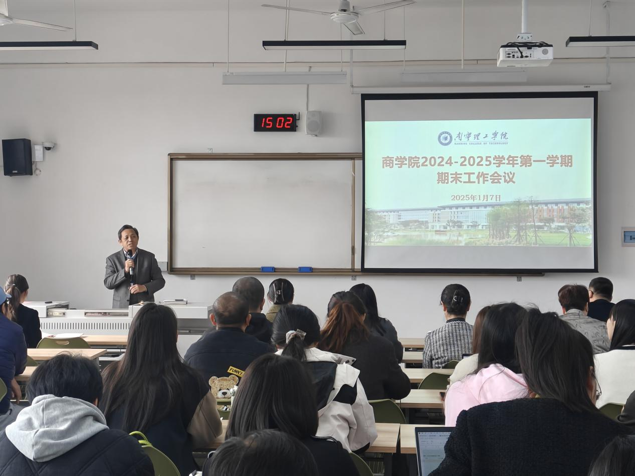 2025年1月7日下午,商学院2023-2024年第一学期期末工作会议在A3208教室成功召开。校长王金叶、院长姚瑞基,党总支书记姚顺良,院长助理卢亚和以及全体教职工参加会议。大会由学院党总支书记姚顺良主持。