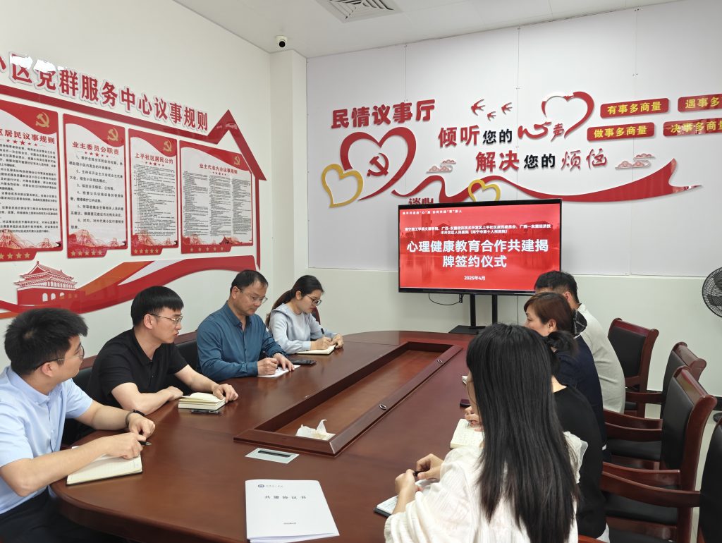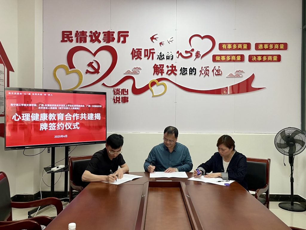 为深化校地合作、推动心理健康服务向基层延伸,4月14日下午,南宁理工学院文理学院联合广西-东盟经济技术开发区上平社区居民委员会、广西—东盟经济技术开发区人民医院(南宁市第十人民医院)举行心理健康教育合作共建揭牌签约仪式。文理学院党总支书记刘武钢、南宁市第十人民医院精神医学主任医师温健、上平社区党委书记 居委会主任韦凤华等三方代表出席活动,围绕“医校家社”四位一体服务模式建设展开深度研讨,共同签署合作协议并为共建基地揭牌。