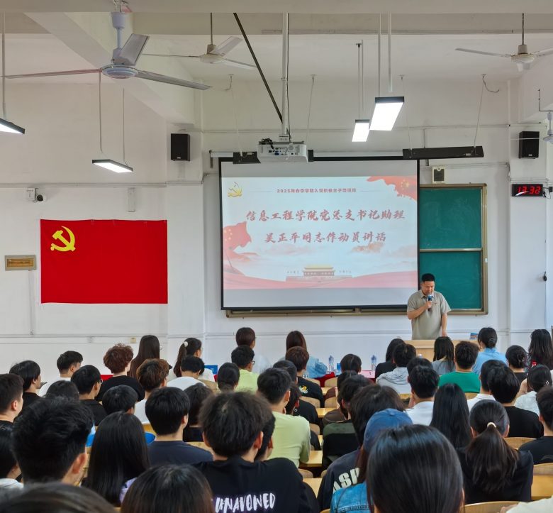 信息工程学院党总支书记助理吴正平同志在入党积极分子培训班上作动员讲话,他指出,开展入党积极分子培训是确保党员队伍“源头活水”清澈的根本保障。希望全体入党积极分子珍视此次宝贵的学习契机,以高标准严格要求自己,全身心投入党的知识学习,不断提升自身思想政治素质,以切实的行动积极向党组织靠拢,争取早日成为一名光荣的中国共产党党员。