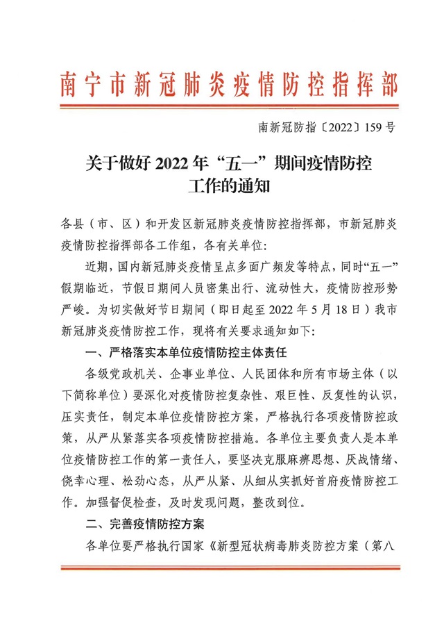 现将《关于做好2022年“五一”期间疫情防控工作的通知》((南新冠防指〔2022〕159号))转发给你们,请结合实际,广泛宣传,并迅速贯彻落实到位,做到知晓全覆盖、行动全覆盖。