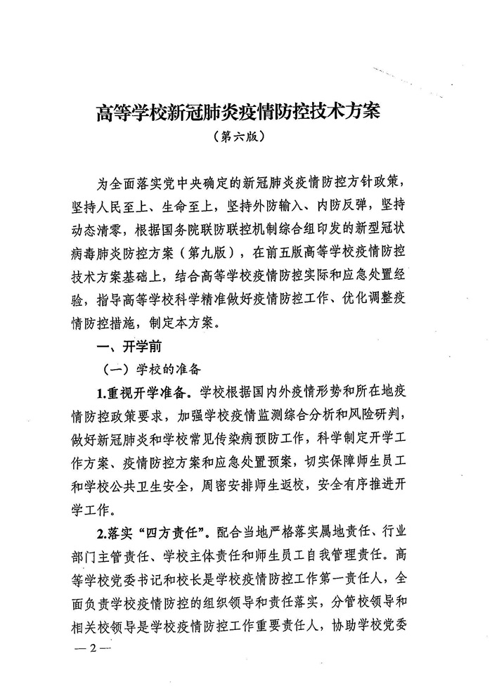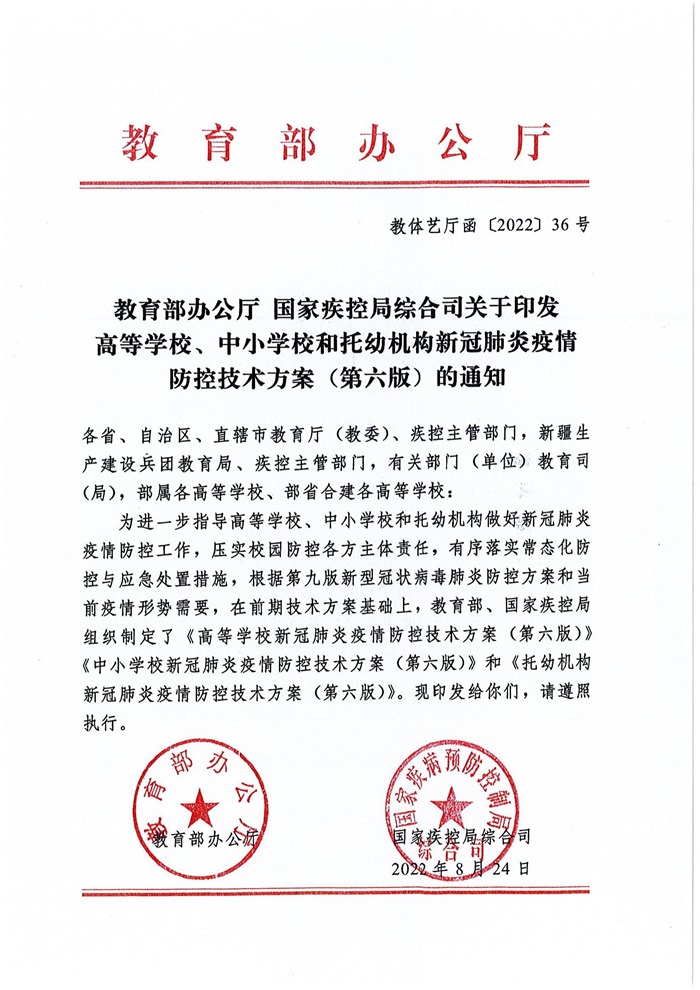 现将《高等学校新冠肺炎疫情防控技术方案(第六版) 》(教体艺厅函〔2022〕36号)转发给你们,请结合实际,广泛宣传,并迅速贯彻落实到位,做到知晓全覆盖、行动全覆盖。