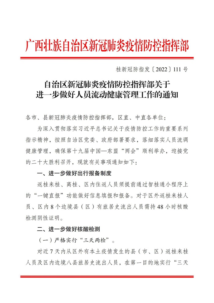 现将《自治区新冠肺炎疫情防控指挥部关于进一步做好人员流动健康管理工作的通知 》(桂新冠防指发〔2022〕111号)转发给你们,请结合实际,广泛宣传,并迅速贯彻落实到位,做到知晓全覆盖、行动全覆盖。