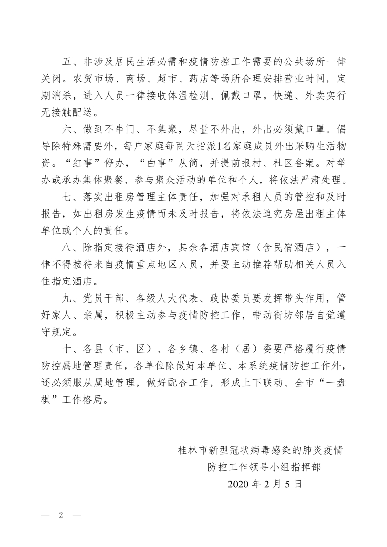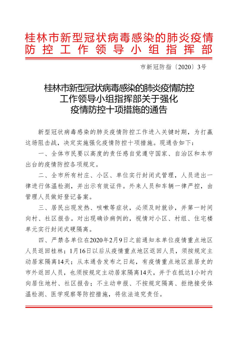 现转发《桂林市新型冠状病毒感染的肺炎疫情防控工作领导小组指挥部关于强化疫情防控十项措施的通告》,请各位师生加强学习宣传、认真贯彻落实。