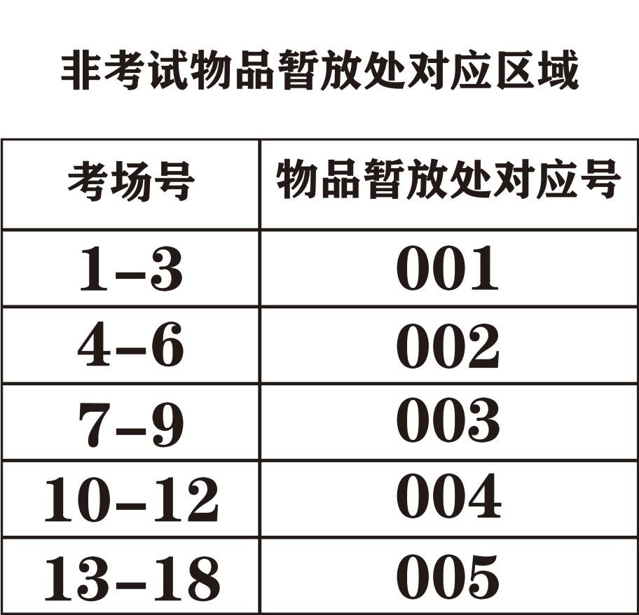 考点(考试封闭管理区域)入口处均预留一定的“非考试物品暂放处”提供考生暂时放置个人物品。考点不负责保管考生个人物品。具体考场对应放置物品暂放处对应号见附图,请考生先行放置再过安检。