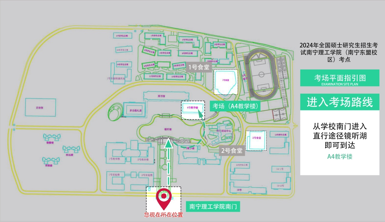 12月22日至24日期间,考生(含家长陪同)出示准考证,可进入南宁理工学院(南宁东盟校区)校门,不接受考生及家长驾车入校。各位考生从学校南门(正门)进校后,请考生按照道路指示牌和工作人员指引步行到考场(A4教学楼)。