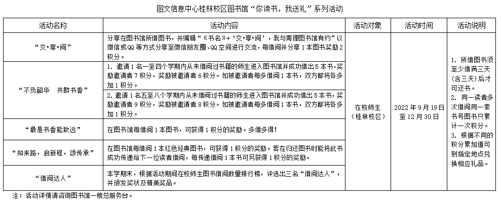 为大力推动校园文化建设进程,营造积极向上的校园文化氛围,同时充分发挥图书馆文化阵地作用,引导更多的师生主动走进图书馆,多读书,读好书,以书会友,共同品味书香带来的感动与感悟,并让阅读成为一种习惯,图文信息中心将于本学期继续开展“书香南理”系列之“你读书,我送礼”系列活动,具体活动内容如下: