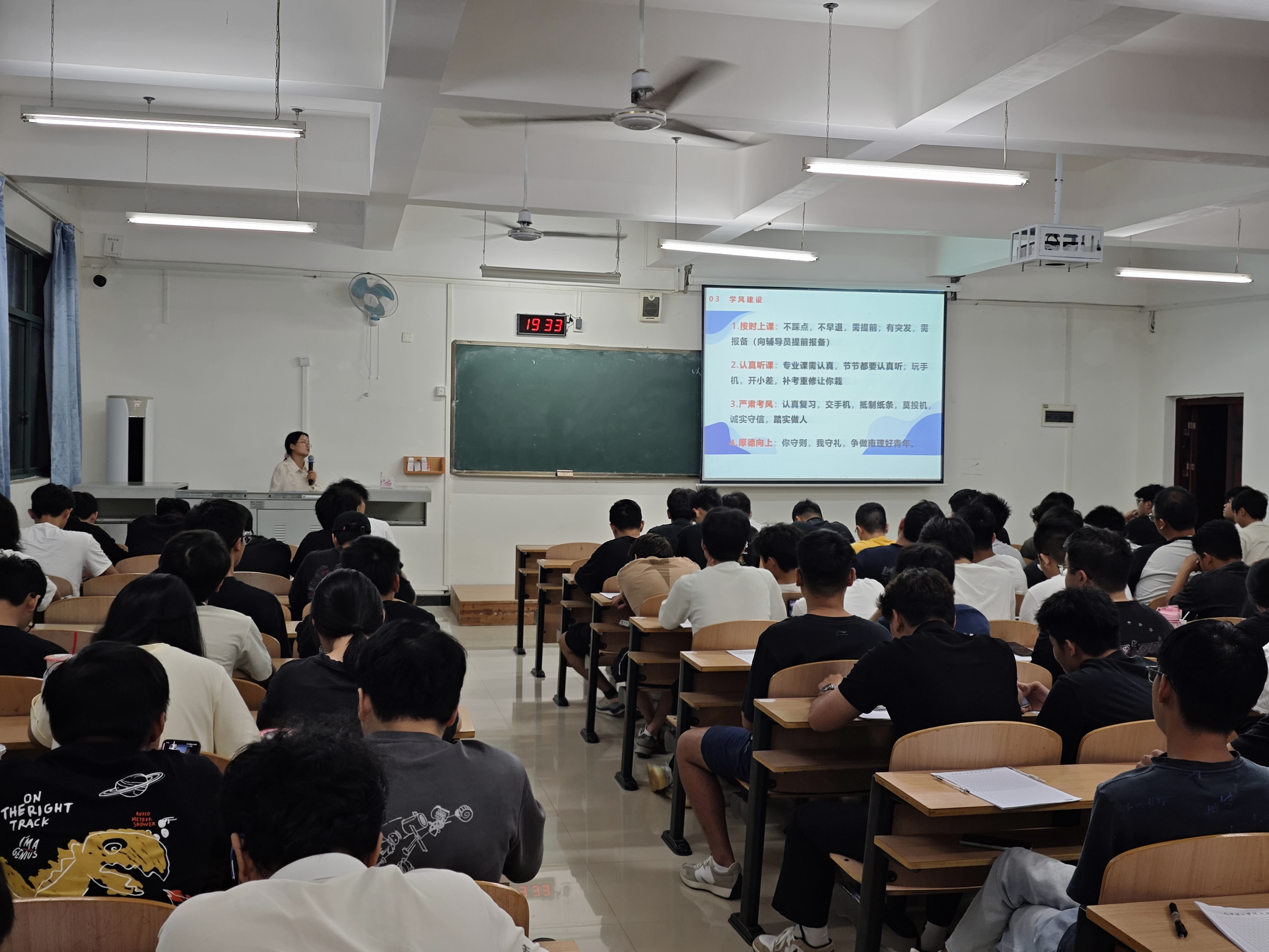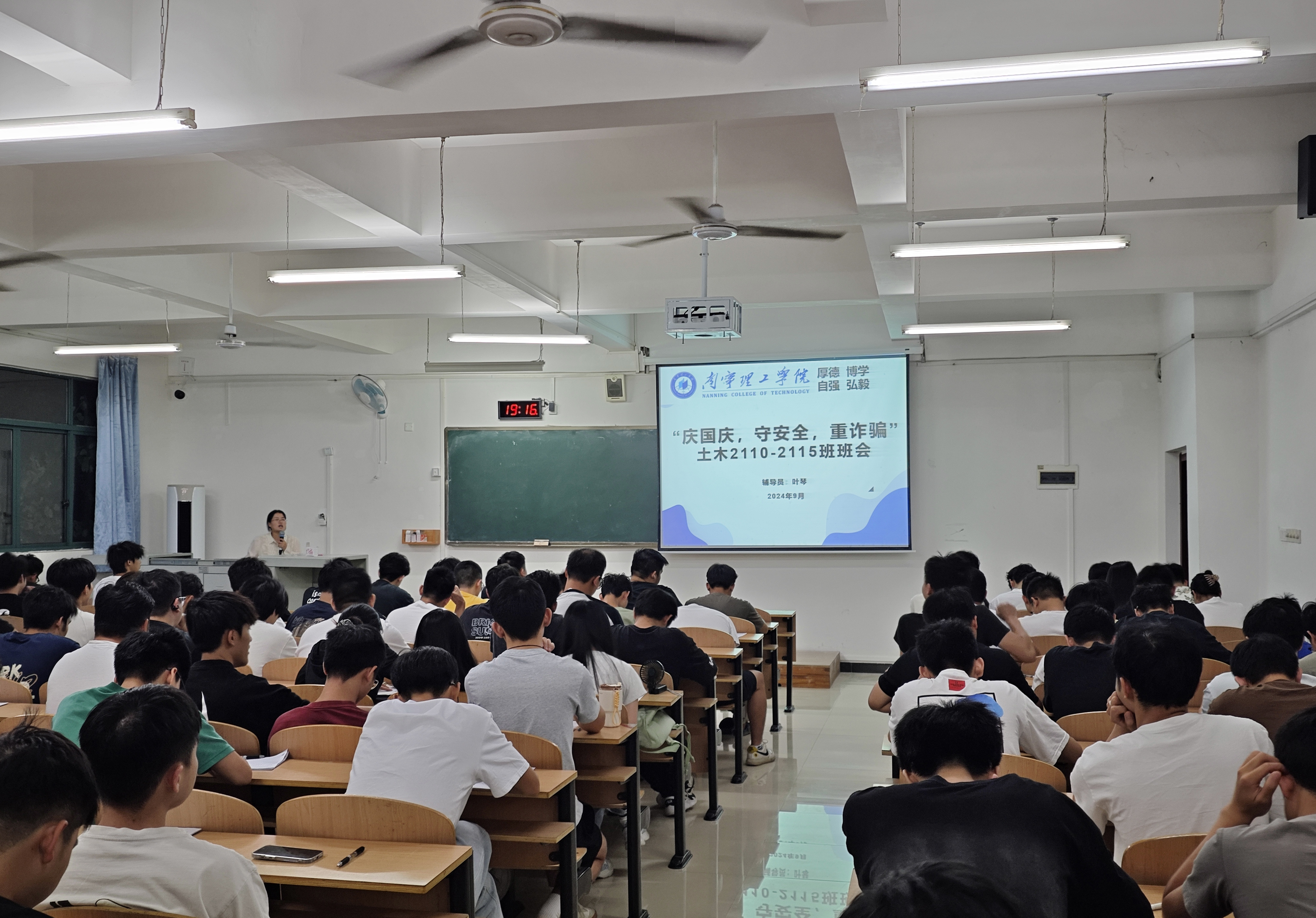 辅导员从四个方面展开班会,首先向大家说明了此次国庆放假时间,本学期离校要求等;其次,辅导员着重进行了安全教育,主要包括人身安全、旅游安全、财产安全、网络安全(特别是电信诈骗)、正确处理个人情感问题、禁止私自下河游泳等;再次,辅导员强调了遵守学校纪律,保持良好的作息习惯、不外宿、不晚归、不酗酒不闹事等;最后,辅导员再次强调了学风建设,要求大家注意上课着装、不迟到不早退不缺勤、课上不做与上课无关的事宜等等。