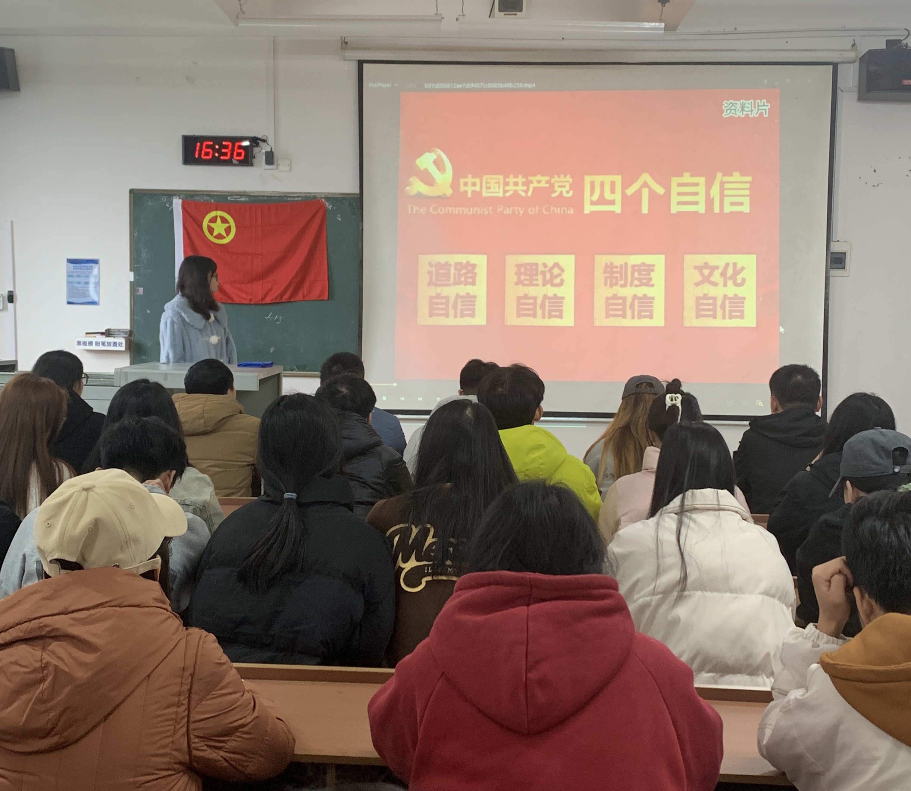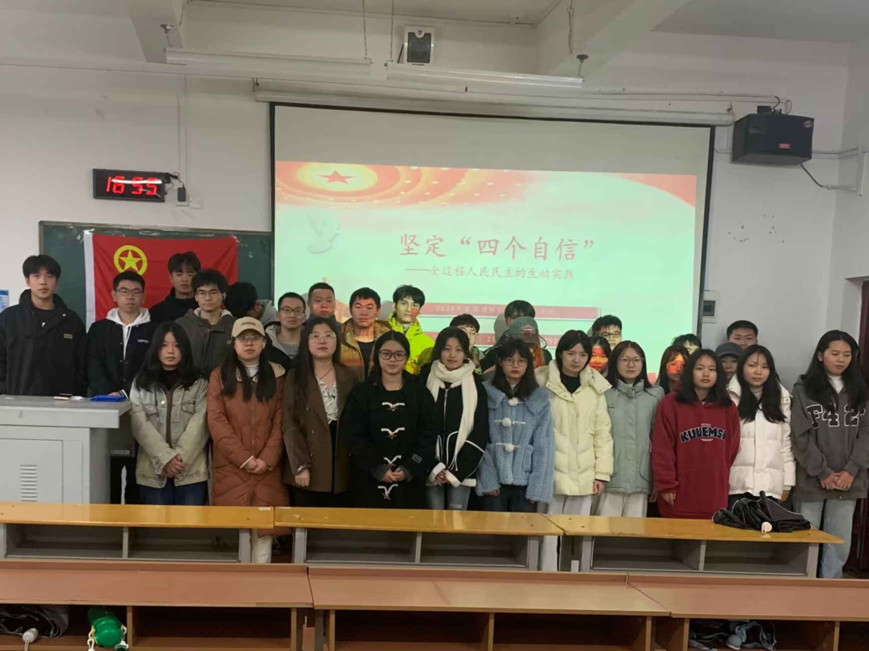 为了引导团员和青年深刻感悟我国国家制度和国家治理体系的显著优势,鼓励团员和青年有序参与社会主义民主政治实践,更加坚定制度自信。2024年3月14日下午16:00,工程造价2118班团支部在1教1414教室开展了主题为“坚定‘四个自信’——全过程人民民主的生动实践”的团日活动。
