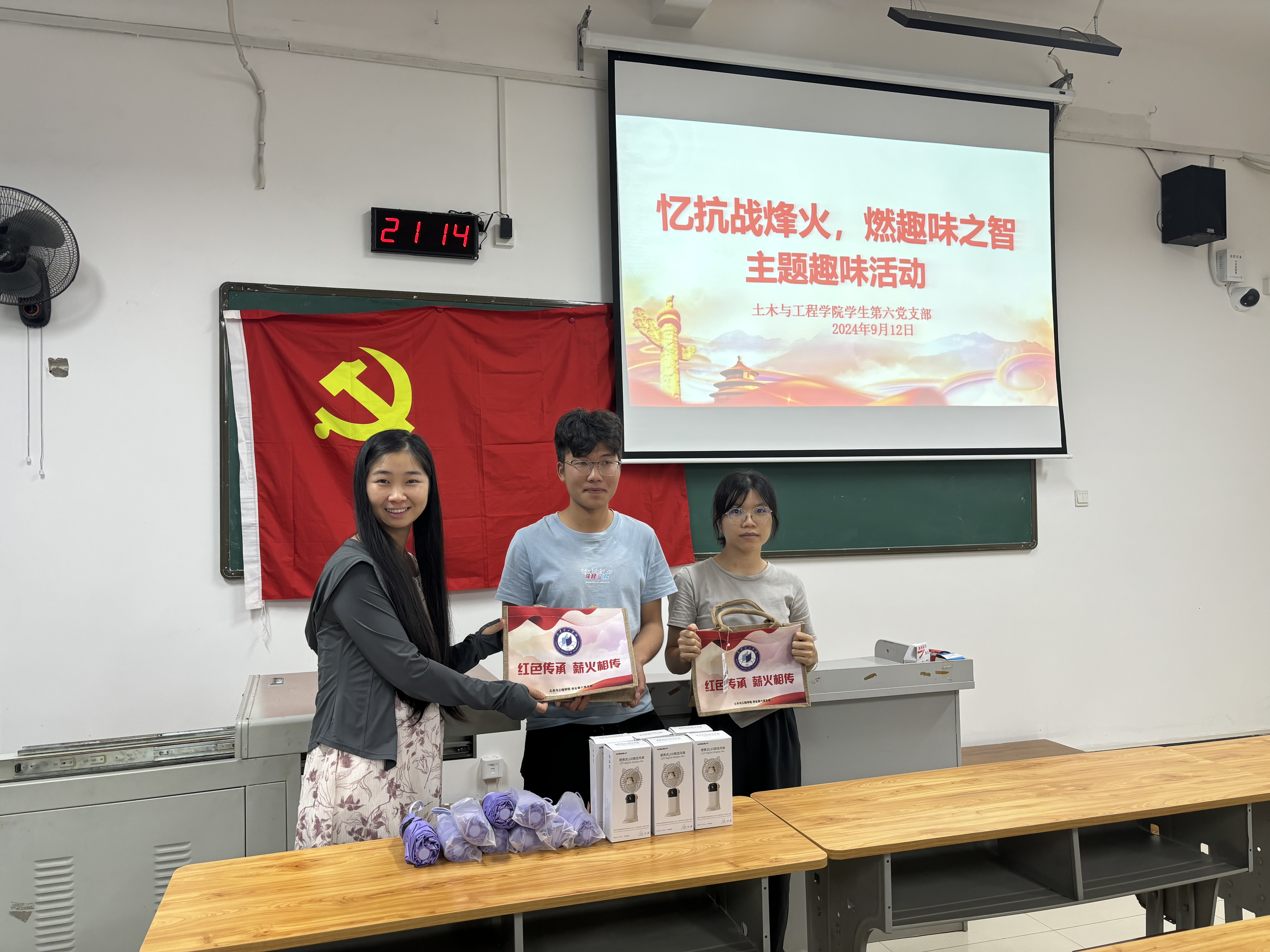 在抗战胜利的精神感召下,土木与工程学院学生第六党支部9月12日在4108开展了一场别开生面的“忆抗战烽火,燃趣味之志”党日活动。