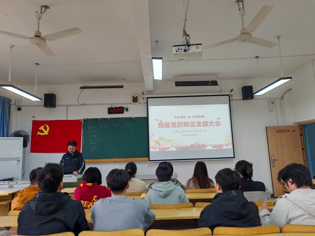 为有效提高党支部活力,注入新力量。11月30日,土木学生第七党支部在4227教室隆重举行了预备党员转正大会。大会由钟嘉科同志主持,支部全体成员参加了此次会议。