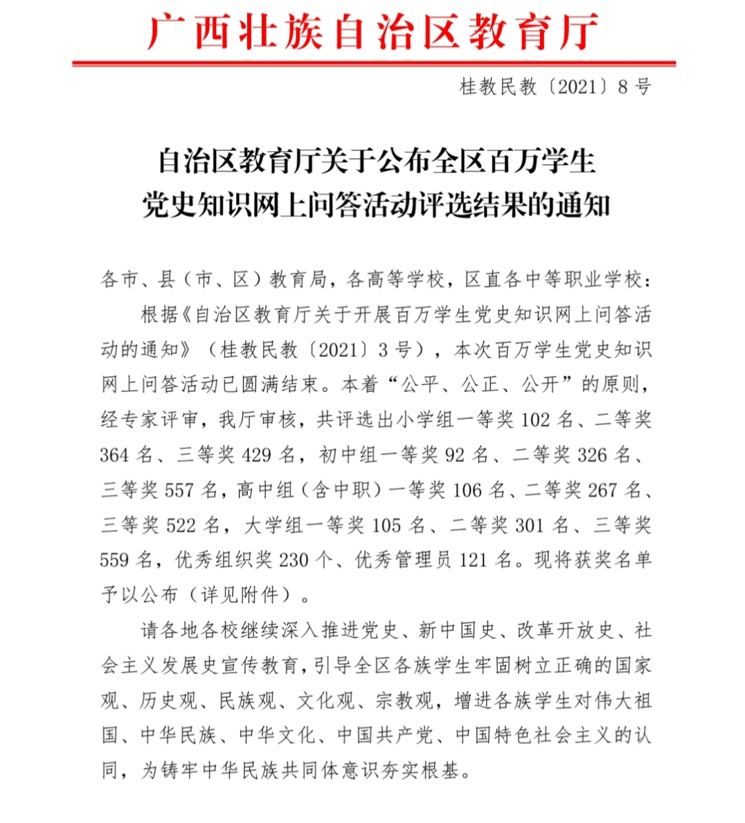 据悉,本次党史知识网上问答活动本着“公平、公正、公开”的原则,经专家评审,我厅审核,共评选出小学组一等奖102名、二等奖364名、三等奖429名,初中组一等奖92名、二等奖326名、三等奖557名,高中组(含中职)一等奖106名、二等奖267名、三等奖522名,大学组一等奖105名、二等奖301名、三等奖559名,优秀组织奖230个、优秀管理员121名。
