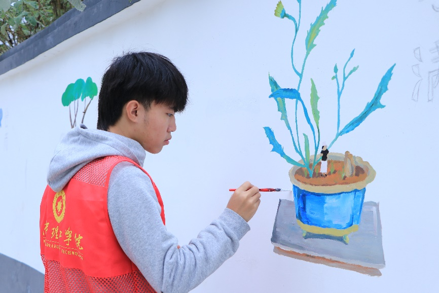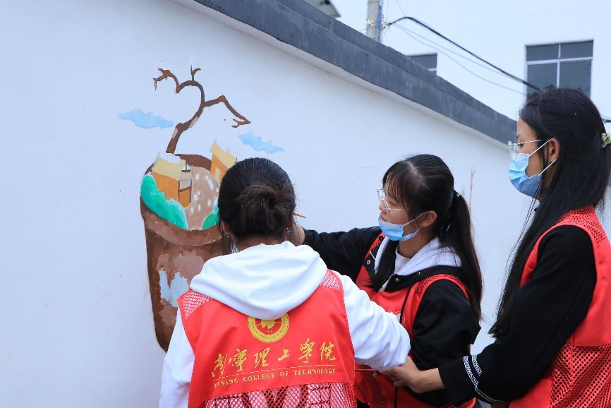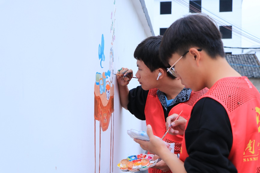为美化乡村生活,营造文明人居环境,弘扬“奉献、友爱、互助、进步”的志愿精神,南宁理工学院团委联合桂林市雁山区青年志愿者协会深入到开展墙体彩绘活动。数十名志愿者分配各自任务,用灵巧的双手和灵动的画笔在两个周的时间里完成了长达40米的长墙彩绘任务。志愿者们将对大埠乡的美好祝愿凝聚在这一排文化墙当中。彩绘通过二十四节气与颇具中国风的绘画风格结合,成为大家了解中国传统文化的窗口,也成了一道靓丽的风景线。