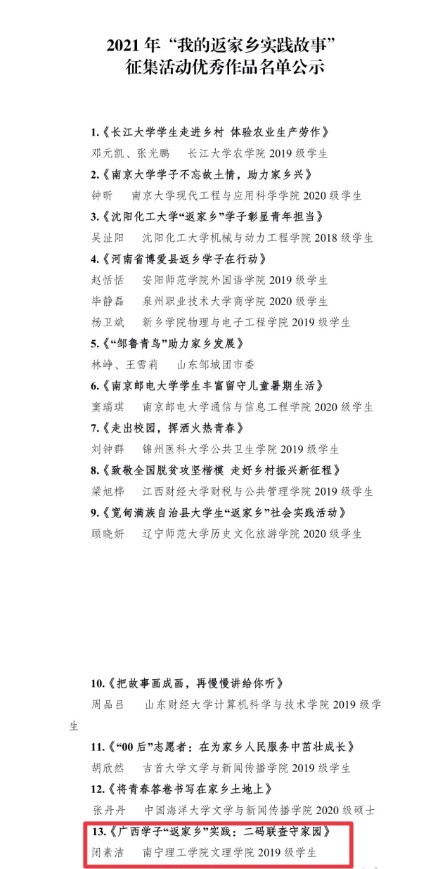 经报名审核、作品发布、网络展示、综合评审等环节,12月8日对遴选出的优秀作品予以公示,我校文理学院2019级学生闭素洁的作品《广西学子“返家乡”实践:二码联查守家园》成功入选。