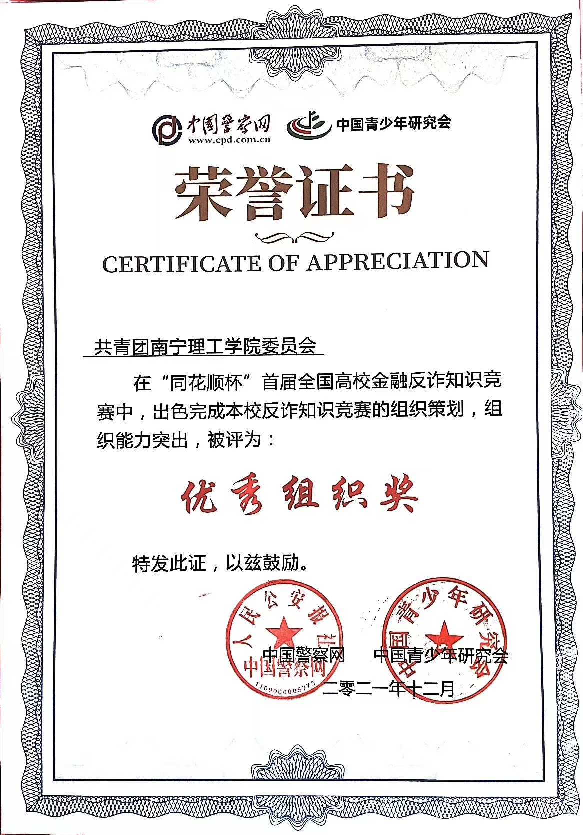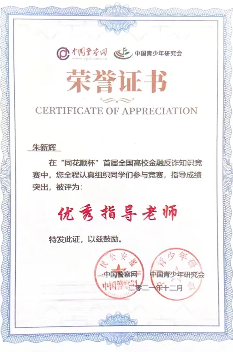 随着社会的不断发展,信息技术不断地提高,如何正确消费,理性消费,维护正当权益成为了我校一直努力的目标。近日,由中国警察网、中国青少年研究会主办的“同花顺杯”首届全国高校金融反诈知识竞赛校赛阶段已在落下帷幕,全国共有2500+所高校参与,累计参与人数超24万。 最终我校团委书记朱新辉老师获得“优秀指导老师”称号;我校团委以及校团委、学生会获“优秀组织奖”称号。