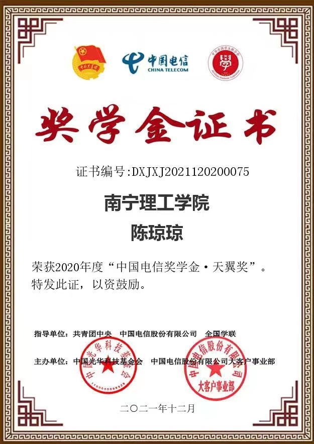 “中国电信奖学金”是由共青团中央、中国电信集团公司及全国学联联合设立,为深入学习贯彻习近平新时代中国特色社会主义思想,遴选和推介一批优秀大学生典型,凝聚和引领当代大学生树立远大理想、热爱伟大祖国、担当时代责任、勇于砥砺奋斗、练就过硬本领、锤炼品德修为的评选活动。经校地推荐、省级初评和全国评审,我校2018级土木工程学院陈琼琼同学获得“中国电信奖学金·天翼奖”。