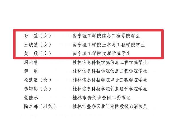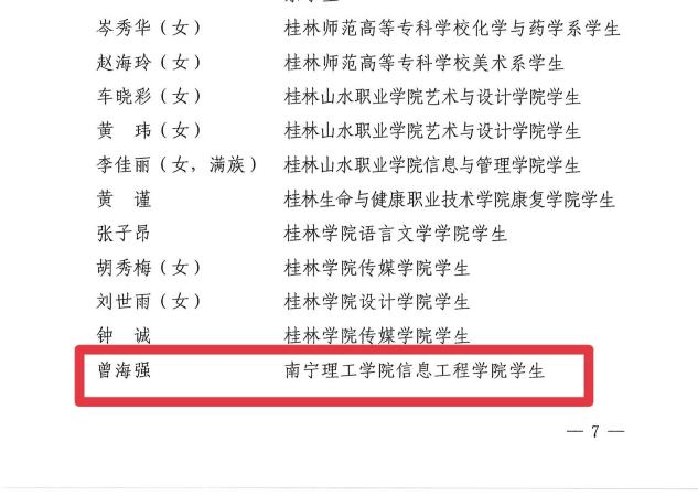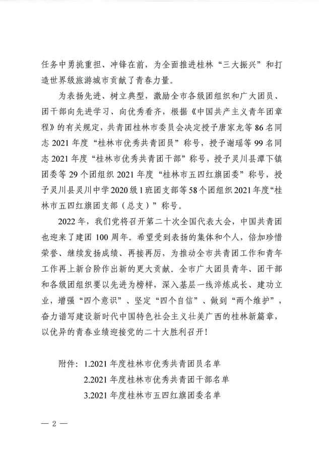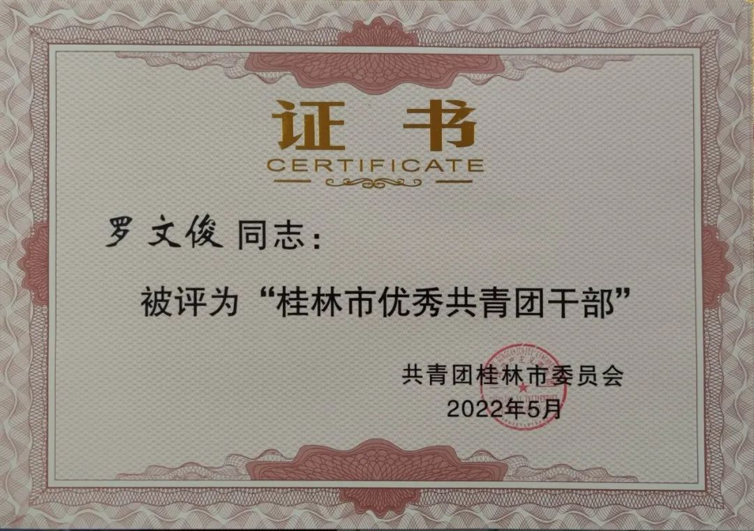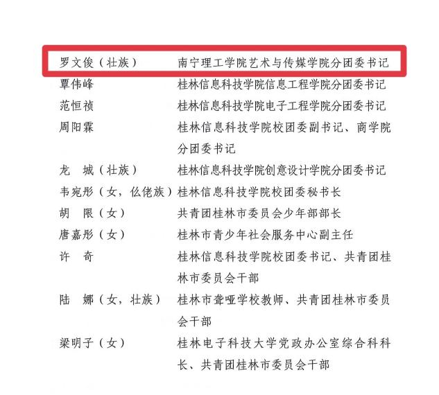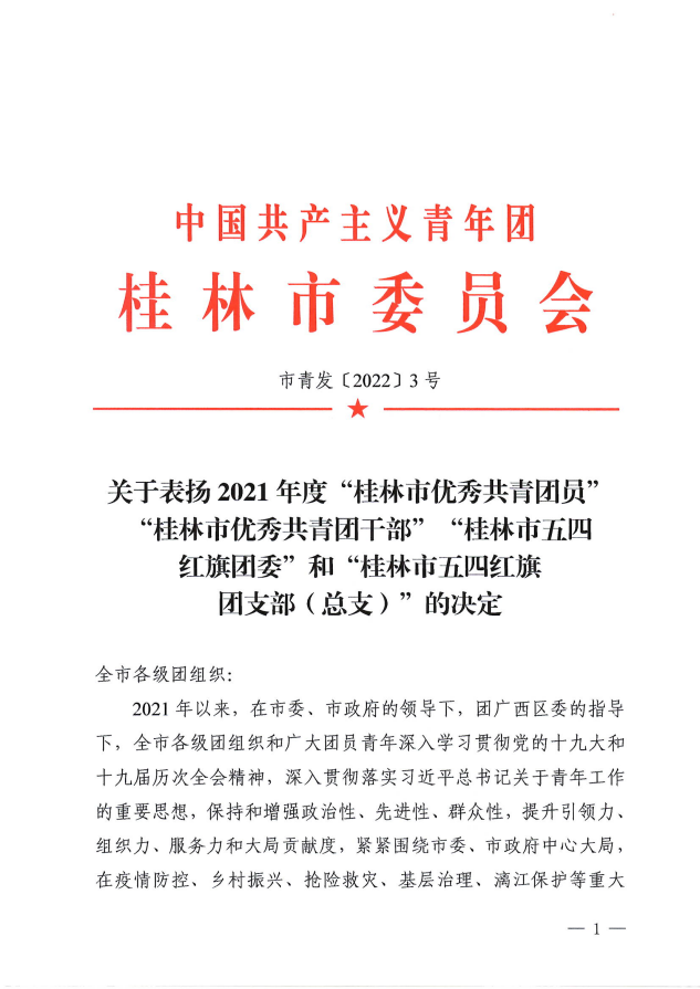 近日,共青团桂林市委员会印发了《关于表扬2021年度“桂林市优秀共青团员”、“桂林市优秀共青团干部”、“桂林市五四红旗团委”和“桂林市五四红旗团支部(总支)”的决定》(市青发〔2022〕3号)。我校罗文俊老师获“桂林市优秀共青团干部”荣誉称号;曾海强、孙莹、王敏慧、黄欣四位同学获“桂林市优秀共青团员”荣誉称号;我校信息工程学院团总支、文理学院团总支获“桂林市五四红旗团支部(总支)”荣誉称号。