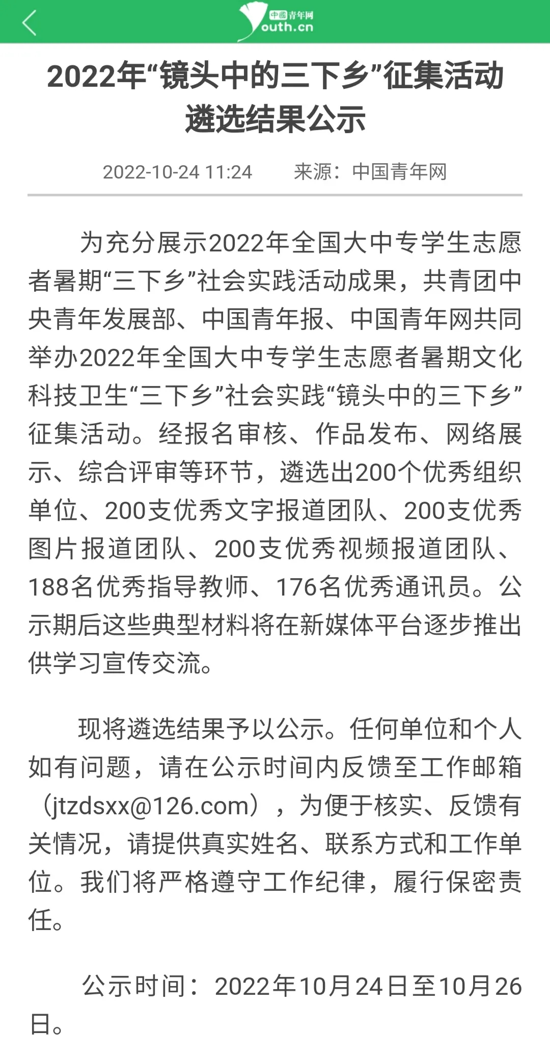 为充分展示2022年全国大中专学生志愿者暑期“三下乡”社会实践活动成果,共青团中央青年发展部、中国青年报、中国青年网共同举办2022年全国大中专学生志愿者暑期文化科技卫生“三下乡”社会实践“镜头中的三下乡”征集活动。经报名审核、作品发布、网络展示、综合评审等环节,遴选出200个优秀组织单位、200支优秀文字报道团队、200支优秀图片报道团队、200支优秀视频报道团队、188名优秀指导教师、176名优秀通讯员。
