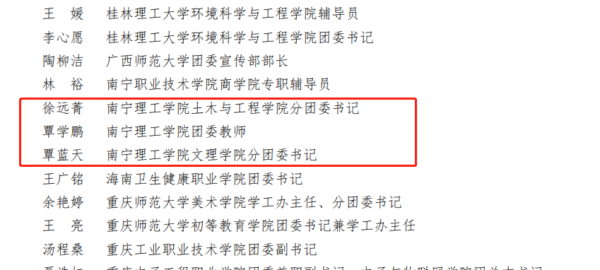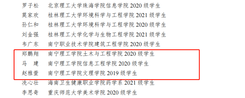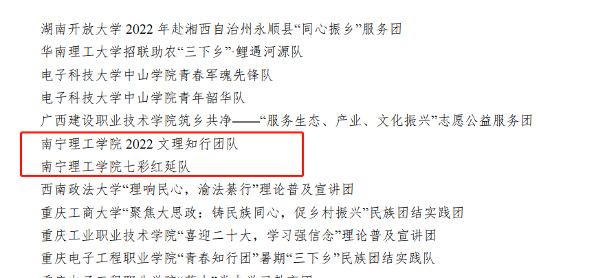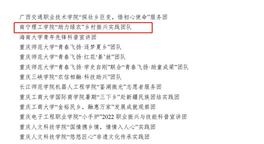 我校团委成功荣获优秀组织单位,这也是我校连续三年获此殊荣;2022文理知行团队和七彩红延队荣获优秀文字团队;“助力绿农”乡村振兴实践团队荣获优秀视频团队;土木与工程学院分团委书记徐远菁,文理学院分团委书记覃蓝天,团委老师覃学鹏三位老师荣获优秀指导教师名单;郑鹏翔,马建,赵雅萱三位同学荣获优秀通讯员名单。