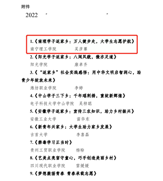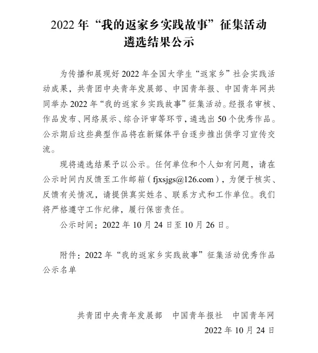 为传播和展现好2022年全国大学生“返家乡”社会实践活动成果,共青团中央青年发展部、中国青年报、中国青年网共同举办2022年“我的返家乡实践故事”征集活动。经报名审核、作品发布、网络展示、综合评审等环节,遴选出50个优秀作品。