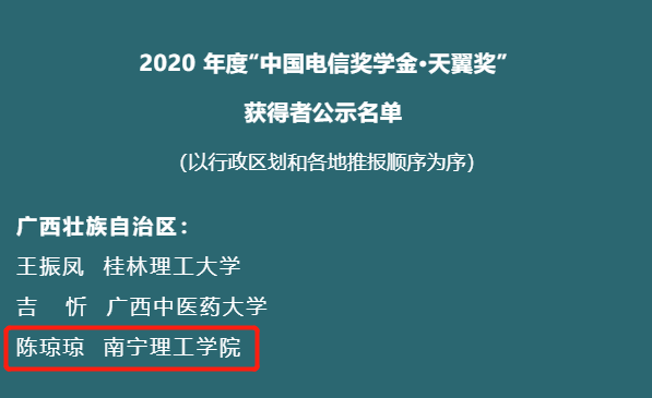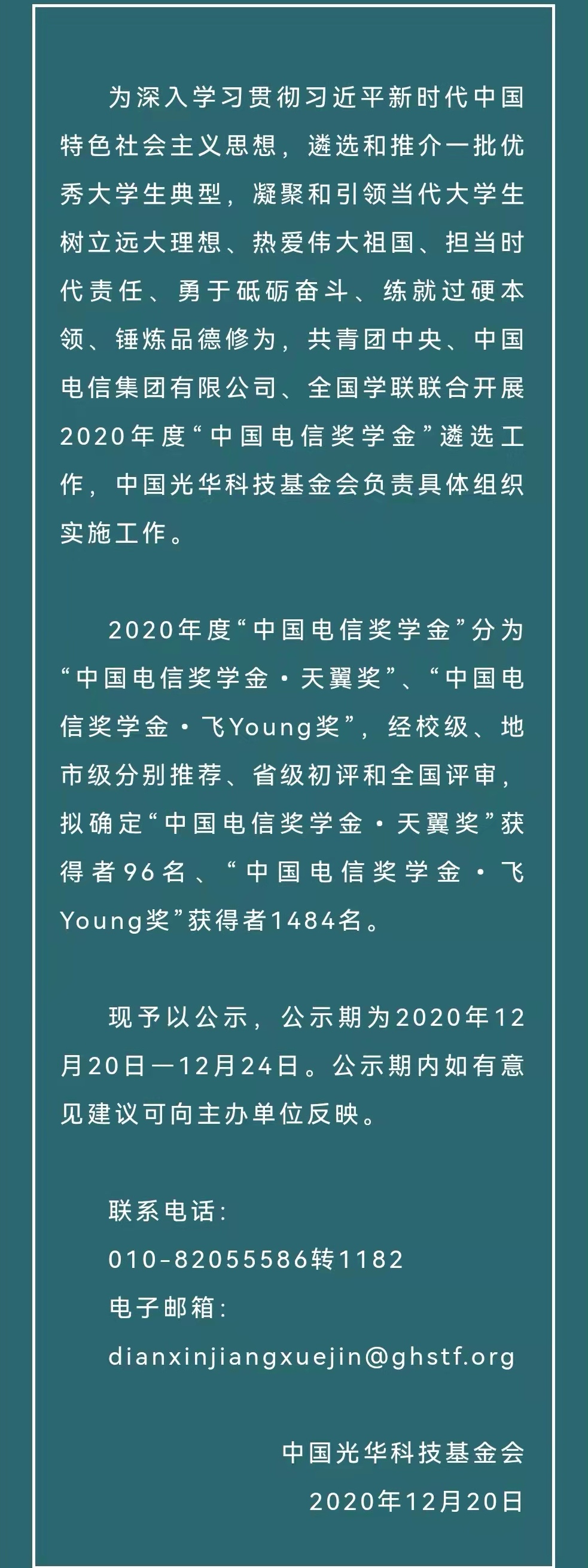 近日,由共青团中央、中国电信集团有限公司、全国学联联合开展的2020年度“中国电信奖学金”评选活动结果揭晓。我校陈琼琼同学获得“中国电信奖学金·天翼奖”。