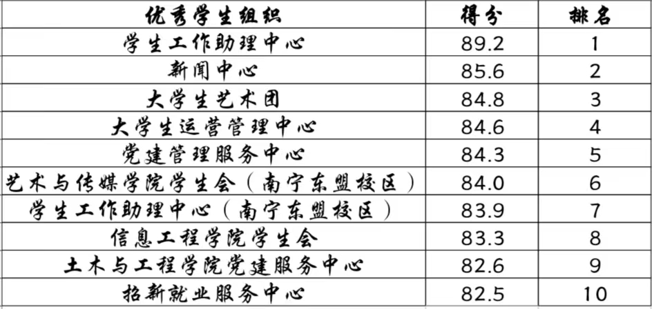 获得优秀学生组织的是学生工作助理中心、新闻中心、大学生艺术团、大学生运营管理中心、党建管理服务中心以及艺术与传媒学院学生会(南宁东盟校区)。