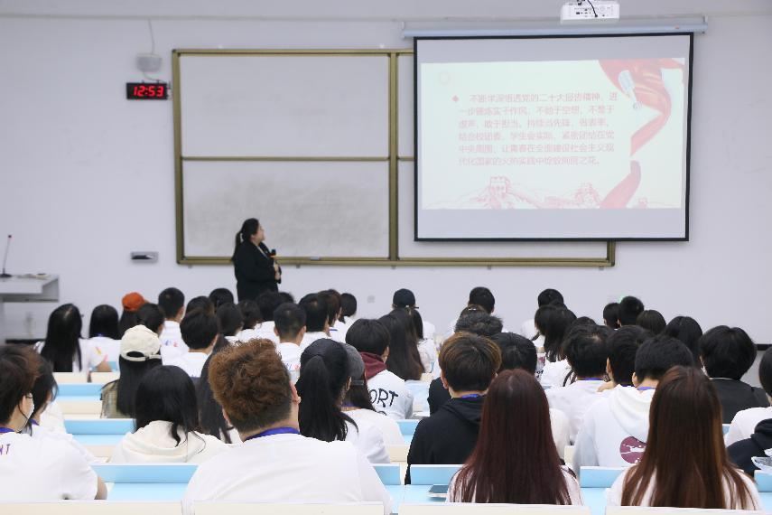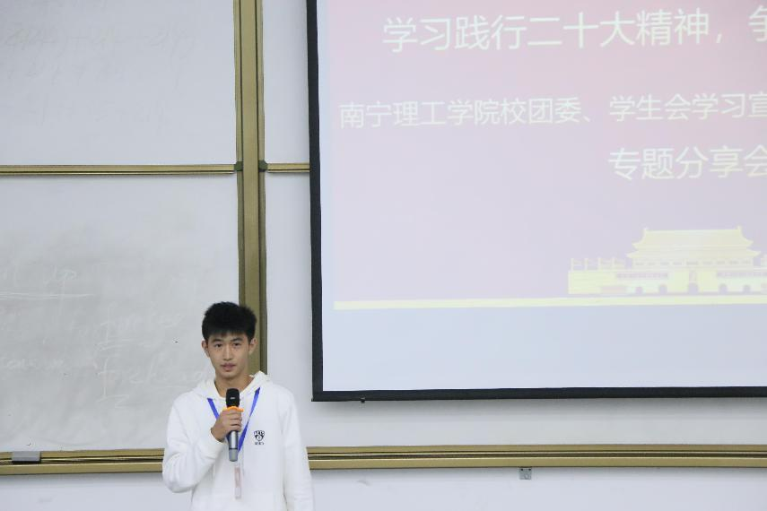 中国共产党第二十次全国代表大会是我国迈上全面建设社会主义现代化国 家的新征程、向第二个百年奋斗目标进军的关键时刻召开的一次十分重要的大会。11月30日,我校南宁东盟校区校团委、学生会于A3217教室组织开展了党的二十大精神专题学习分享会,共同学习贯彻党的二十大精神,校团委、学生会全体成员共同参与此次分享会,本次会议由主席团成员张译文主持。