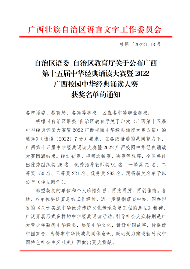 近日广西第十五届中华经典诵读大赛暨2022广西校园中华经典诵读大赛圆满结束。经过初赛、视频选拔赛、决赛等程序,全区共评出优秀组织奖26名,优秀指导教师奖91名,一等奖72名、二等奖150名、三等奖221名、优秀奖293名。