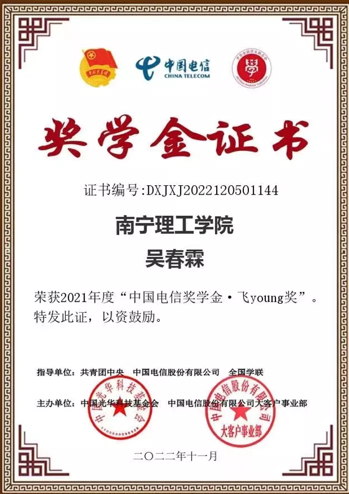 为深入学习贯彻习近平新时代中国特色社会主义思想,特别是习近平总书记关于青年工作的重要思想,由共青团中央、全国学联指导,中国电信集团有限公司、中国光华科技基金会联合举办了2021年度“中国电信奖学金”推报活动。经校级、地市级分别推荐、省级初评和全国评审,确定“中国电信奖学金•天翼奖”获得者98名、“中国电信奖学金•飞Young奖”获得者1486名。其中,我校吴春霖同学在评选中脱颖而出,获得“中国电信奖学金·飞Young奖”。