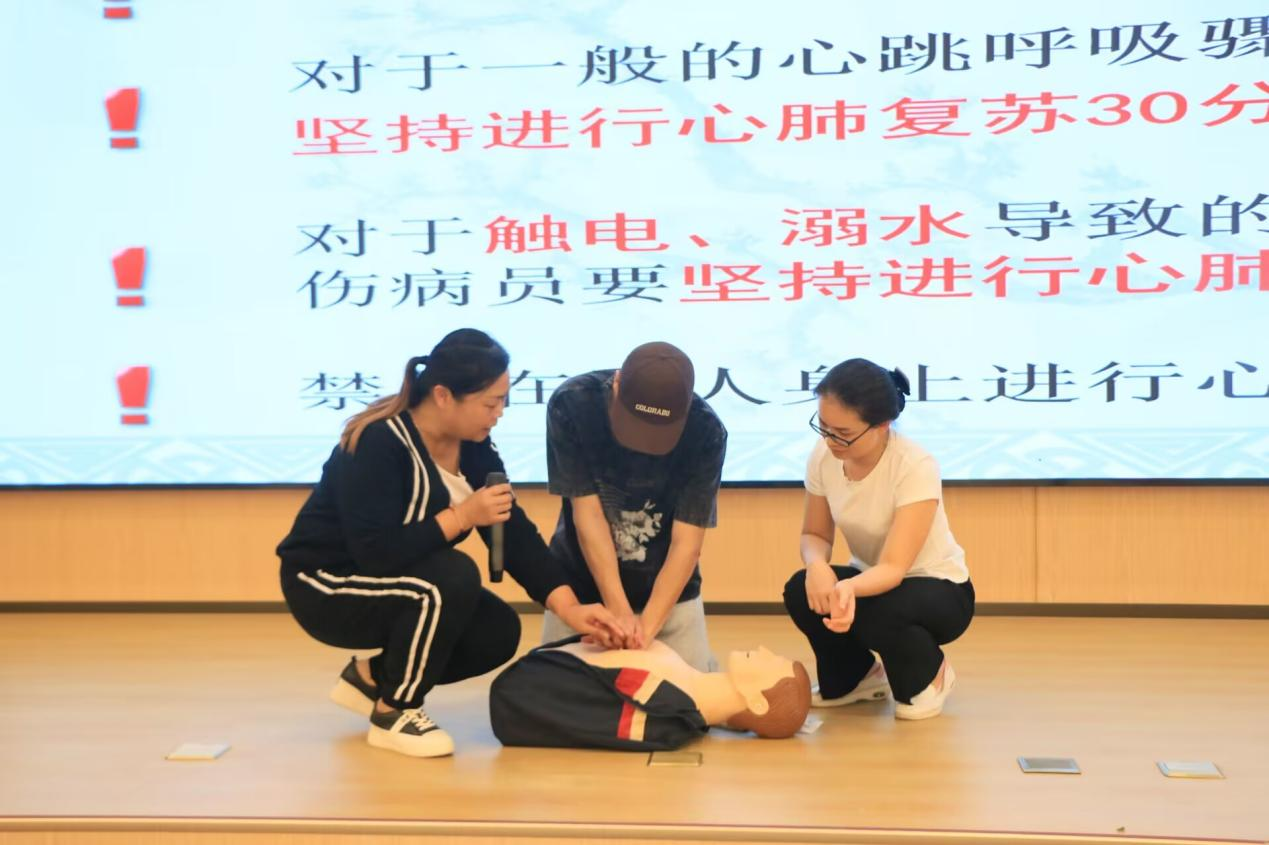 最后,马黔蓉医生通过PPT讲解、现场互动的形式,为大家普及发生紧急情况后的黄金时段为患者正确实施心肺复苏术的知识。马黔蓉医生深入浅出地讲解了应急救援、紧急避险的相关知识以及急救的知识要点,并利用人体模型示范心肺复苏术的各项细节要领,加深学生对技术动作的理解以及对心肺复苏技能的掌握。通过马黔蓉医生的讲解,不仅使同学们认识到急救知识的重要性,同时还掌握了心肺复苏等应急救护的基础知识,提升了自救互助的能力。增强了学校师生对急救的现场判断和处置能力,筑牢校园卫生安全屏障。