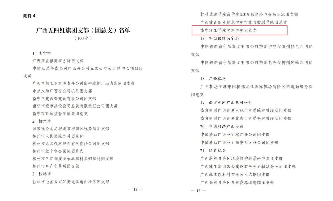 为充分发挥先进典型示范作用,集中展示新时代青年听党指挥、矢志奋斗的精神风貌,激励全区广大青年向先进学习、向优秀看齐,奋发有为、再创佳绩。近日,共青团广西区委揭晓第26届广西青年五四奖章集体(个人)和广西“两红两优”名单,我校文理学院团总支被授予“广西五四红旗团总支”。
