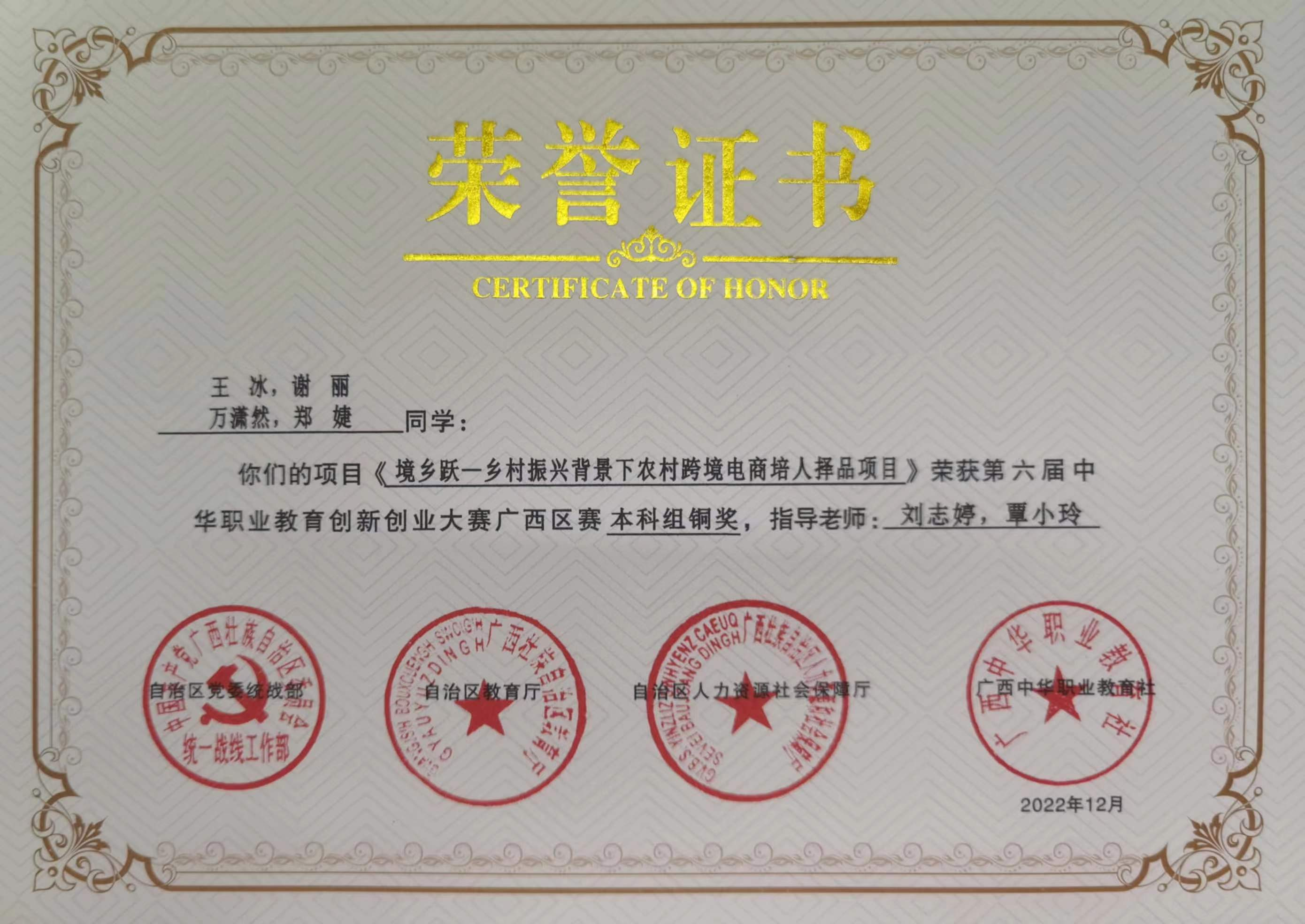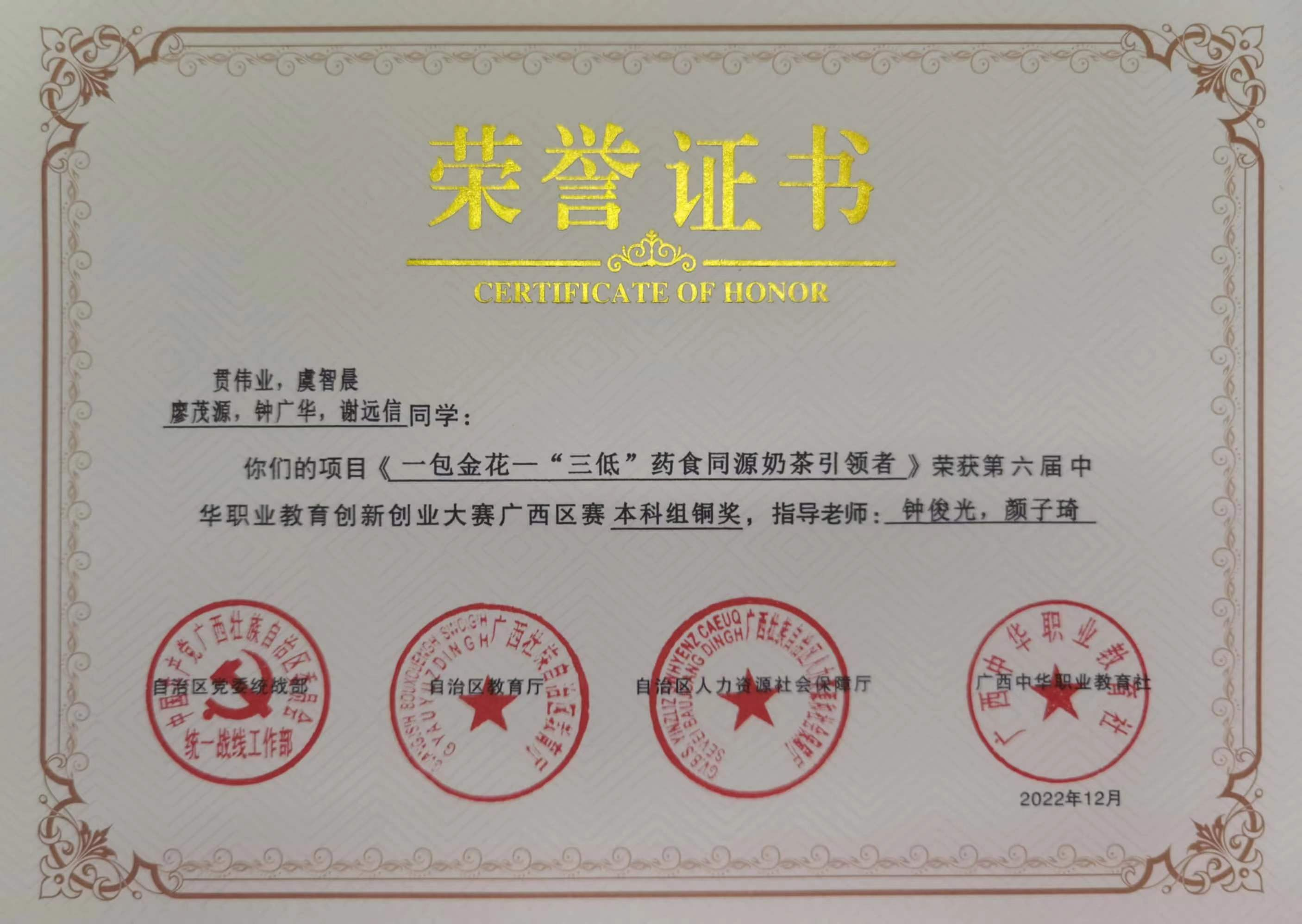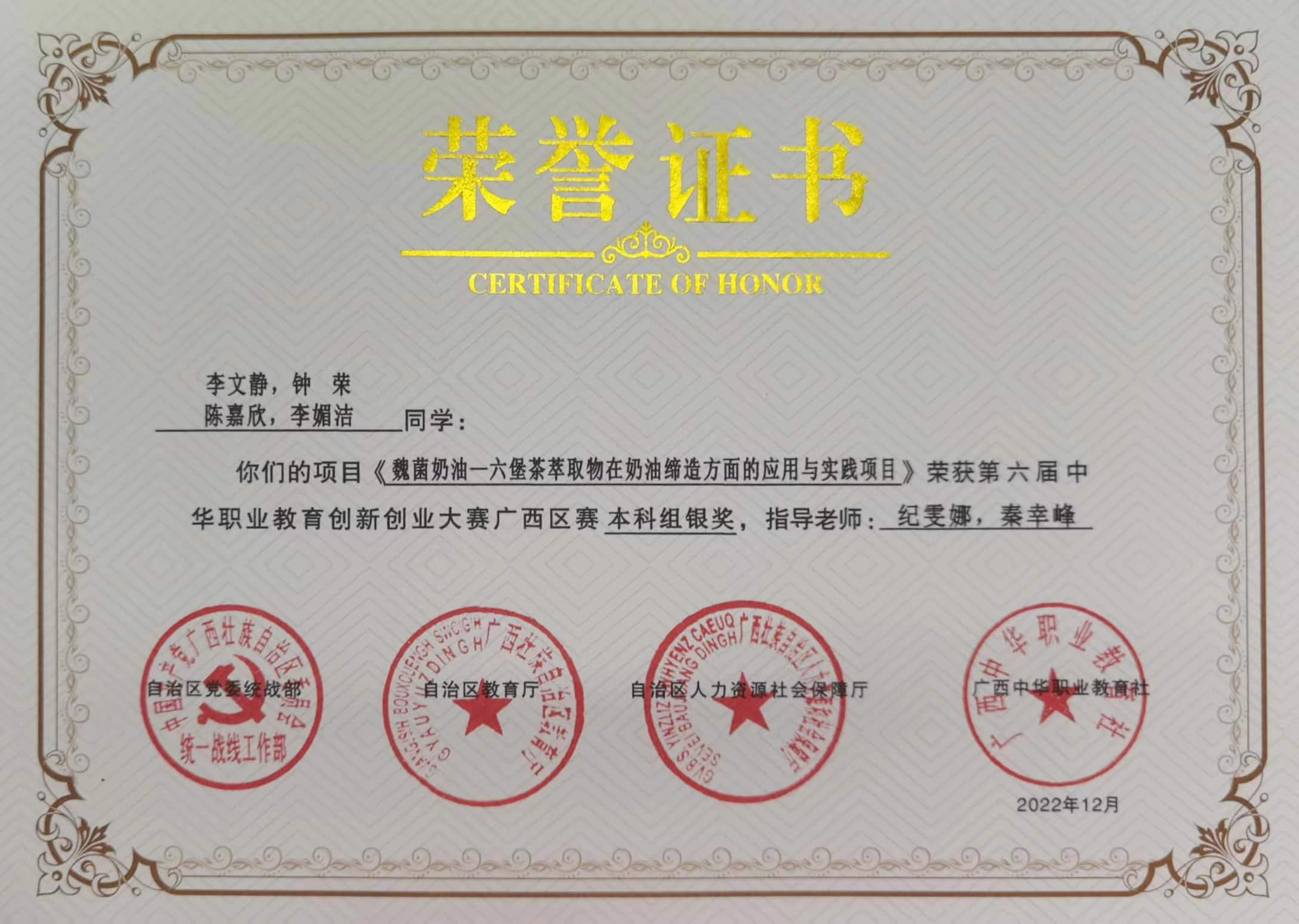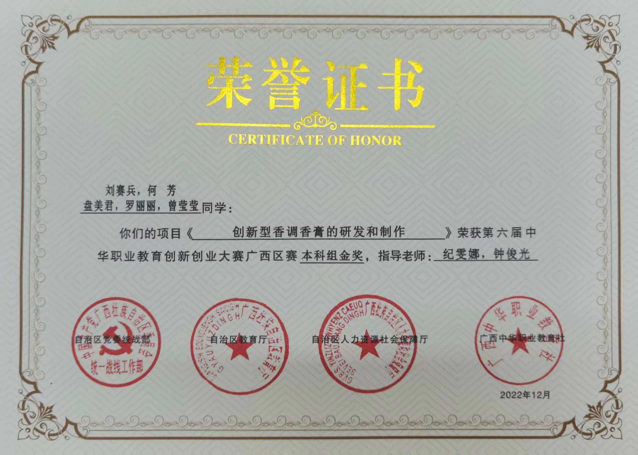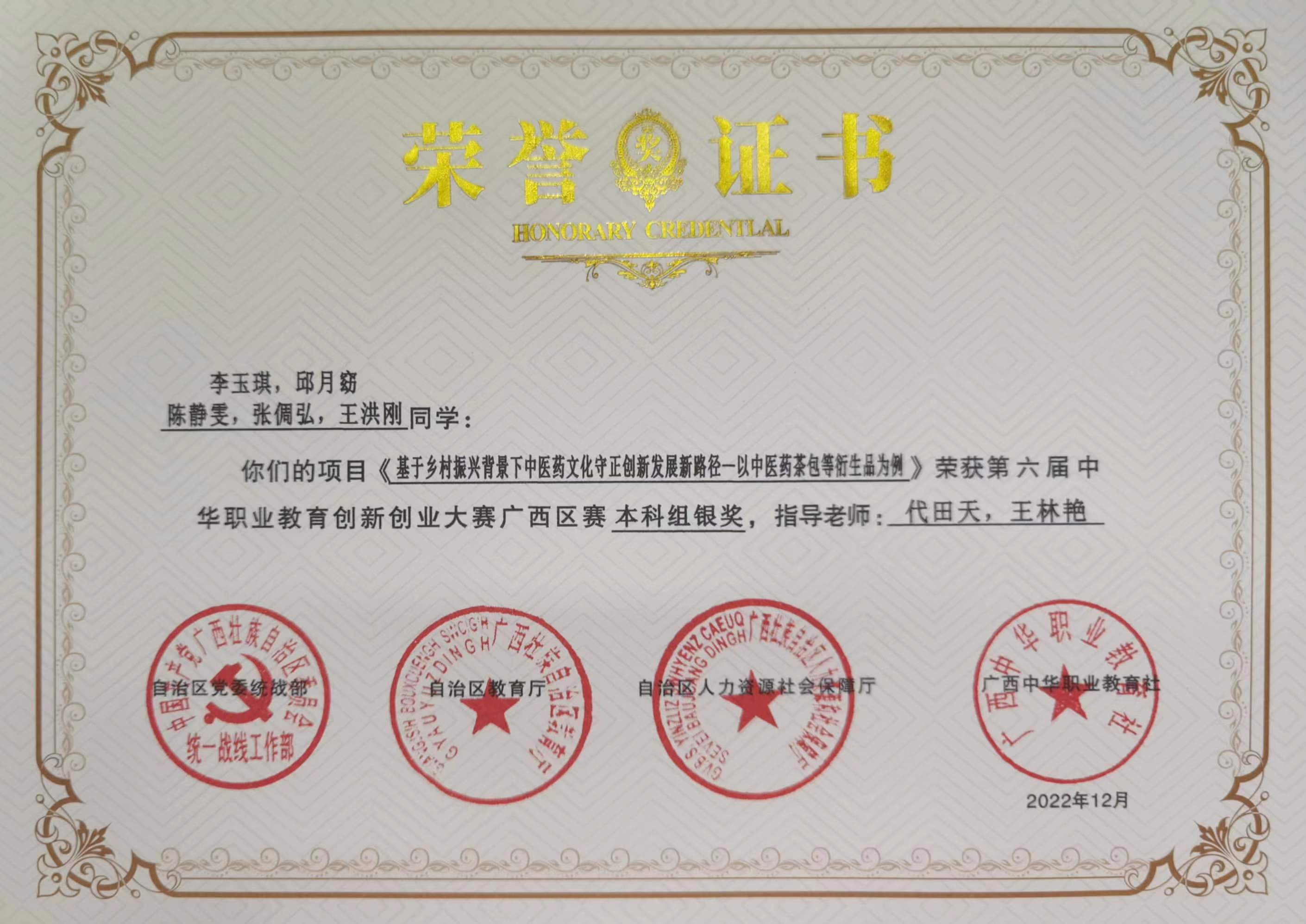 2022年由自治区党委统战部、自治区教育厅等单位联合举办的第六届中华职业教育创新创业大赛广西区赛落下帷幕。本届中华职业教育创新创业大赛以“职教育工匠 双创筑梦想”为主题,参赛项目涵盖制造业、现代农业、生物医药、科技、新能源等多个领域。本次区赛共有89所院校围绕12369个项目展开激烈角逐,经区赛专家委员会评审、主办方审定,最终评选出金奖100项,银奖204项,铜奖382项,其中我校荣获金奖1项,银奖2项,铜奖2项。