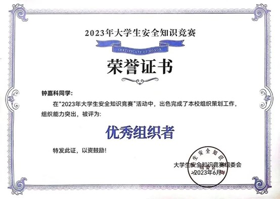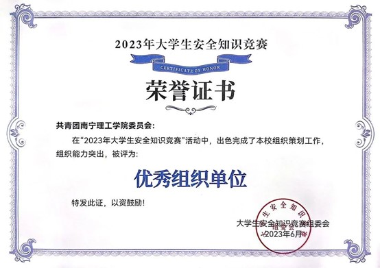 为落实教育部关于国家安全、校园安全等政策要求,深入开展安全教育宣传,有效提高大学生综合安全意识,引导高校学生以安全、健康的身心迎接未来,高校毕业生就业协会、中国青少年研究会联合到梦空间、各高校团委共同开展“大学生安全知识竞赛”活动。在本次大学生安全知识竞赛中我校共青团南宁理工学院委员会荣获优秀组织单位,覃学鹏老师荣获优秀指导老师称号,钟嘉科同学荣获优秀组织者称号。