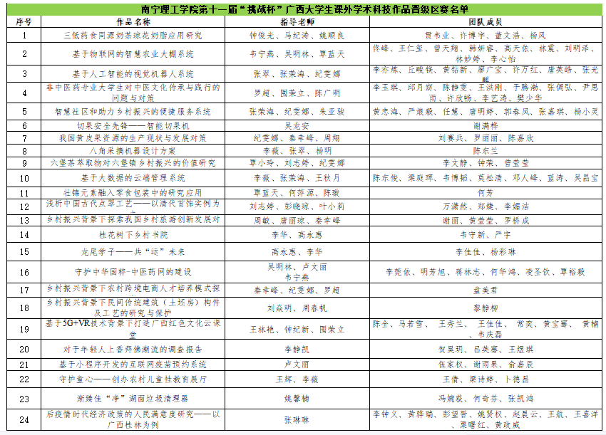 根据文件《关于组织开展第十一届“挑战杯”广西大学生课外学术科技作品竞赛的通知》,经我校各学院评比推报及校级选拔评审,现对拟晋级区赛的作品进行公示,公示时间为五个工作日,从2023年4月5日至2023年4月9日,公示期间如有异议,请与南宁理工学院校团委联系,联系电话:0773-8991664。