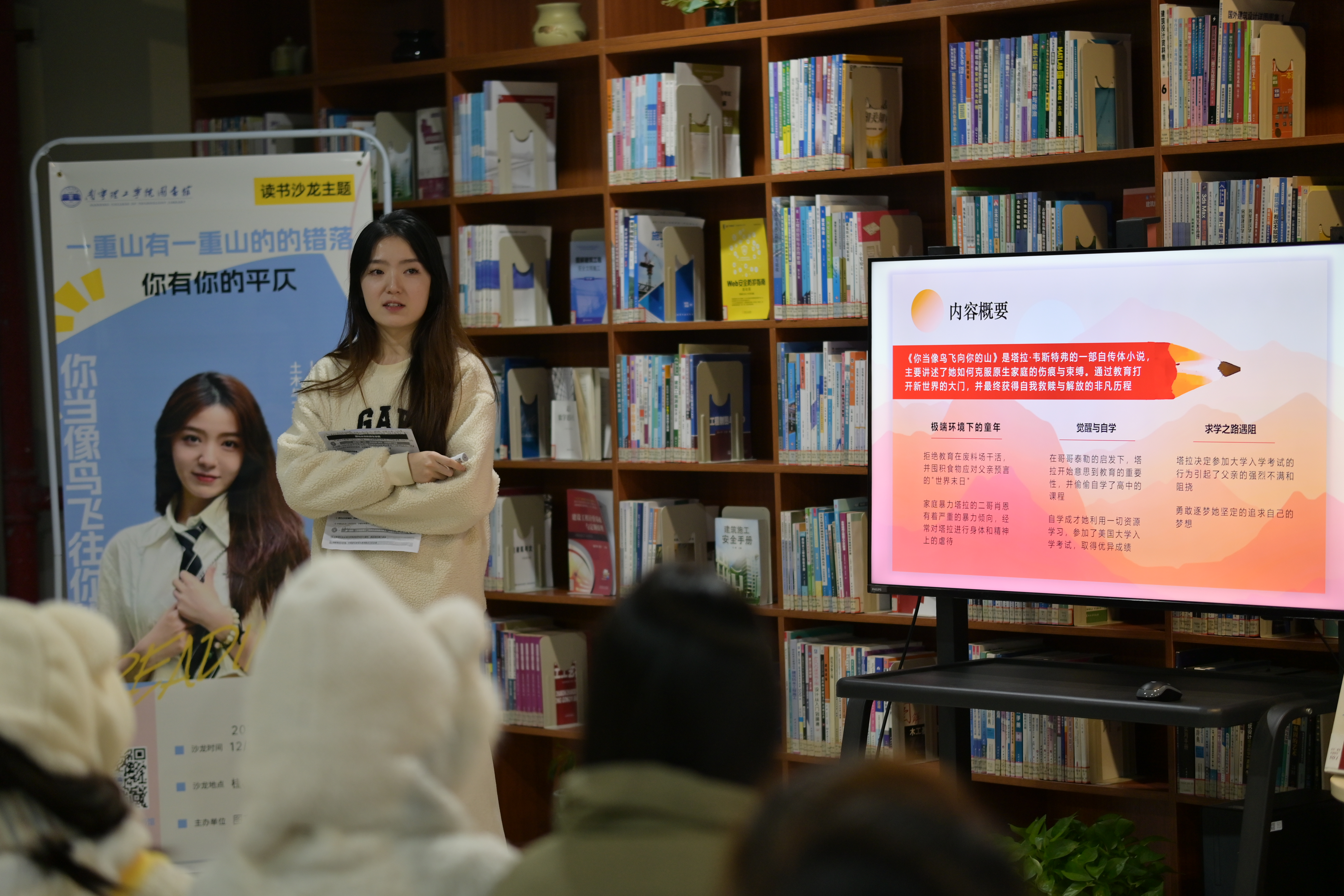 接下来第二场是由郭雨琪老师分享的沙龙主题是“一重山有一重山的错落,你有你的平仄”,她分享的图书是《你当像鸟飞往你的山》这本书,郭老师从作者简介,内容介绍和主要人物经历等方面进行了分享,通过郭老师精彩的讲解,同学们了解到此书是作者塔拉的回忆录,讲述了她独特的成长求学经历。塔拉在一个极端宗教家庭中长大,长期被剥夺正常接受教育的机会,她却通过自学,最终成为剑桥大学博士。