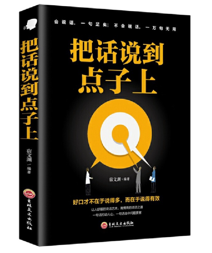 题名:《把话说到点子上》 作者:宿文渊 出版社:吉林文史出版社 馆藏地点:桂林雁山校区种本书库、南宁东盟校区图书馆 索书号:H019-49/385 内容简介:本书主要讲述的是真正会说话的人, 懂得用最简单的语言把意思表达到位, 知晓在最短的时间内把话说到点子上。本书教你把话说得明白、说得得体、说得出色, 适用于交流、面试、交友、谈判、招商、销售、演讲、恋爱、困境等情景, 适用于演讲、职场应答、答记者问、谈恋爱、提亲、推销等场合。