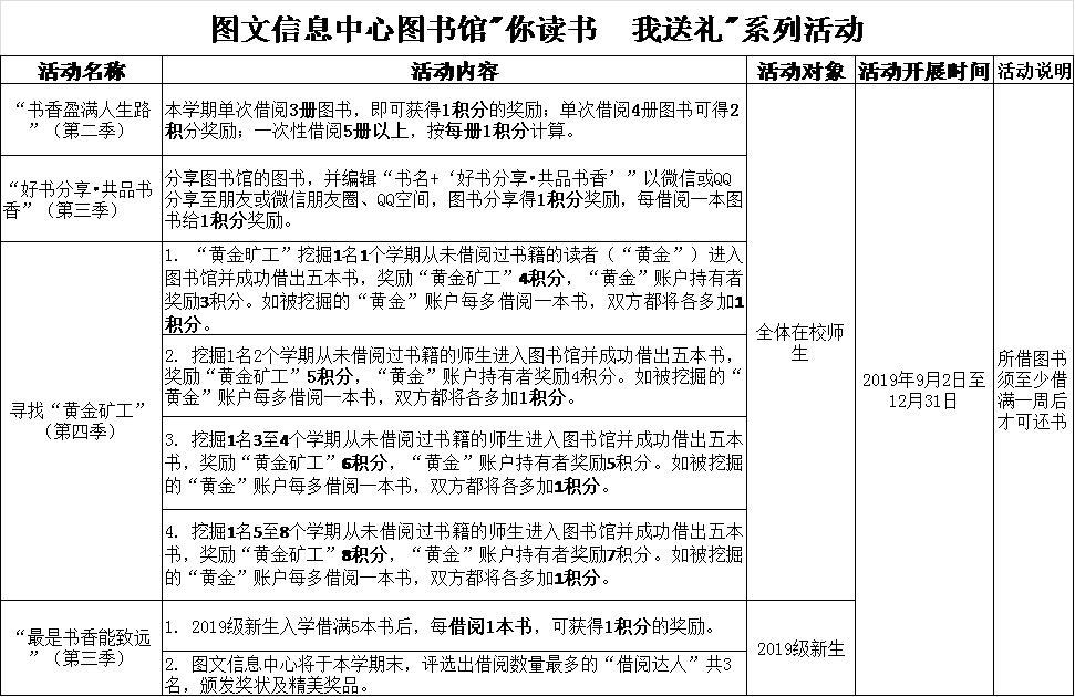 为营造学校积极向上的校园文化氛围,引导更多的师生主动走进图书馆,多读书、读好书。本学期图文信息中心图书馆继续开展“你读书 我送礼”系列(第三季)活动,具体活动内容如下: