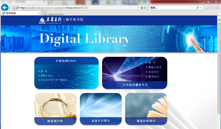 名华数字资源版块包含中国知网、万方知识服务平台、维普期刊网、龙源社科期刊、博看社科期刊等五大主流数字文献资源平台(图3)。具体登录方式如下: