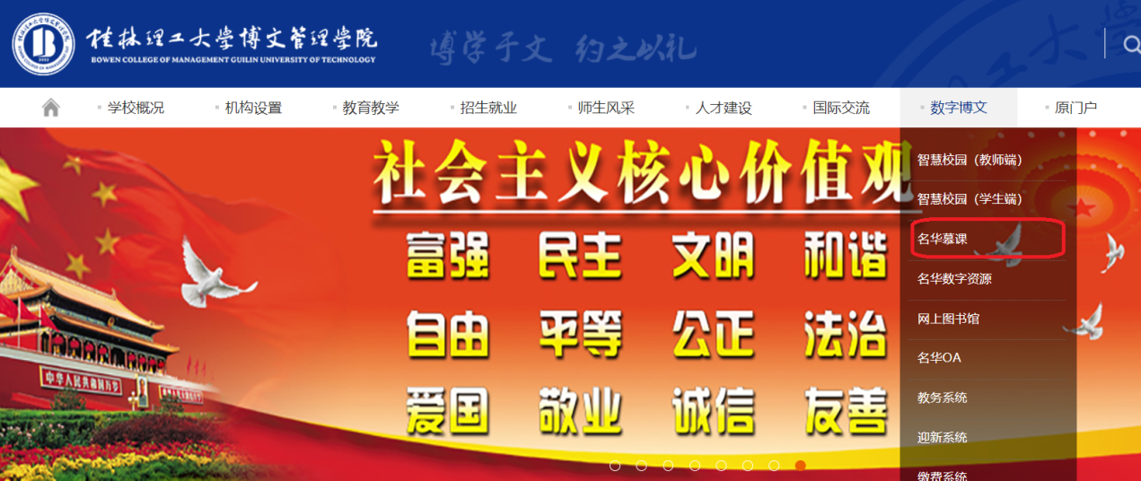 1. 打开学校主页,点击主页下方的“数字博文”-“名华慕课”(图1)。