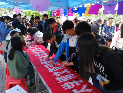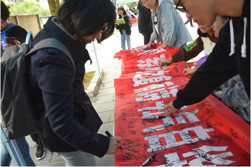 “读书月”活动启动仪式得到了广大师生的支持:同学们积极参与,热情响应,纷纷在启动仪式的横幅上签下了自己的名字;我校图文信息中心副主任、图管会指导老师和我校师生也来到启动仪式的现场签名,并且和图管会的同学们合影留念。