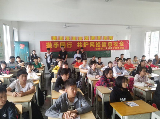 2019年4月19日下午,由桂林理工大学博文管理学院图文信息中心▪网络信息站协同桂林理工大学博文管理学院大学生社团联合会科学技术爱好者协会联合举办的以“网络安全始于心 安全网络践于行”为主题的第二届网络安全文化节之“网络安全知识进校园”活动在桂林市第十七中学顺利举行。本次活动是为了使中小学生了解网络信息安全、如何避免网络带来的信息泄露和危害,以及如何正确解决网络安全问题。在加强本校参赛选手网络安全能力的同时,增强中小学生对网络安全的重视,并对网络安全有更加全面的了解。
