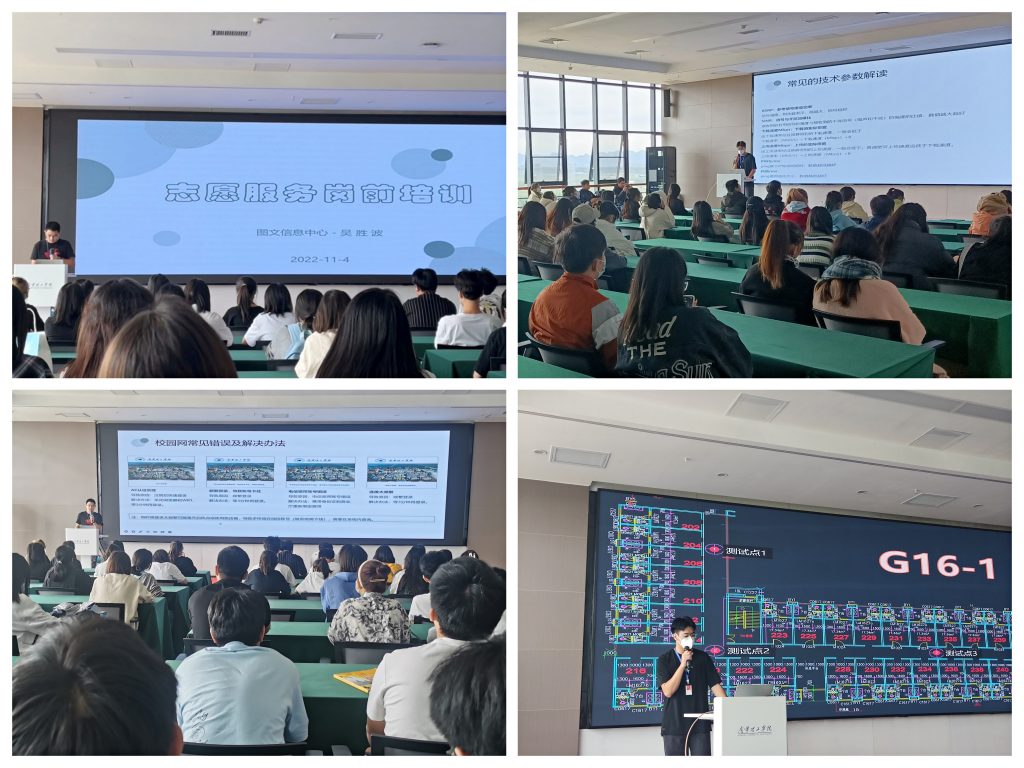为进一步优化南宁东盟校区校园网络、了解用户需求,提升用网体验。2022年11月至12月,图文信息中心先后组织开展校园网络志愿服务公益活动2次。志愿服务活动分为岗前培训、实际操作两个环节。在岗前培训阶段,由专业技术人员对网络基本参数进行解读、介绍测速方法及校园网络常见故障的解决办法,提高志愿者对于基础网络问题的识别及解决能力,同时确保测试数据的真实有效。