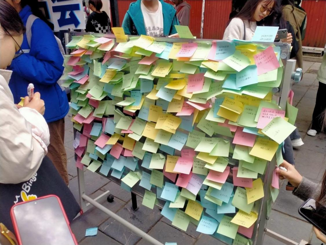 本次活动主要分为两个环节:首先,报名参加活动的同学在便签纸上写出与“读书”两字中的“读”或者“书”相同读音的字构成一个谐音的四字词语、古诗句、谚语等,例如“读(独)树一帜”、“书(疏)风骤雨”等等;然后再附上一本自己推荐的好书书名,并按照活动要求进行分享。本次活动得到了同学们的积极响应。春雨绵绵,但挡不住同学们参加活动的热情。