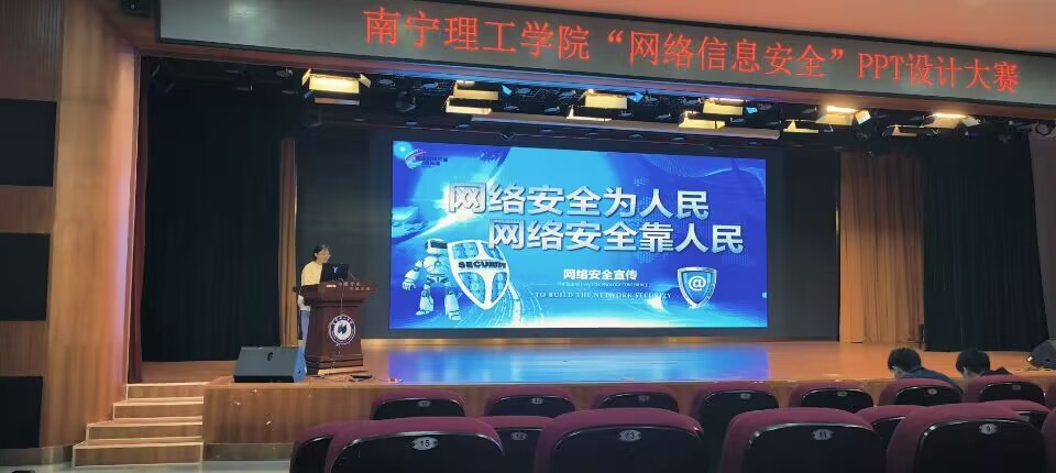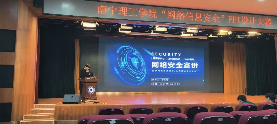 为更进一步地加深大学生网络安全防范意识,并深化同学们的校园网络安全理念,营造安全的校园环境,11月23日晚7点,由我校图文信息中心网络安全管理委员会主办、学生技术服务工作站协办的主题为“网络信息安全”的PPT设计大赛(决赛)活动于一栋报告厅正式举办。出席本次活动的嘉宾有南宁理工学院图文信息中心朱欢老师,网络安全管理委员会吴祉睿学长,网络安全管理委员会王思楚学长,学生技术服务工作站王振洲学长以及五百余名学生作为观众现场参与了本此活动。