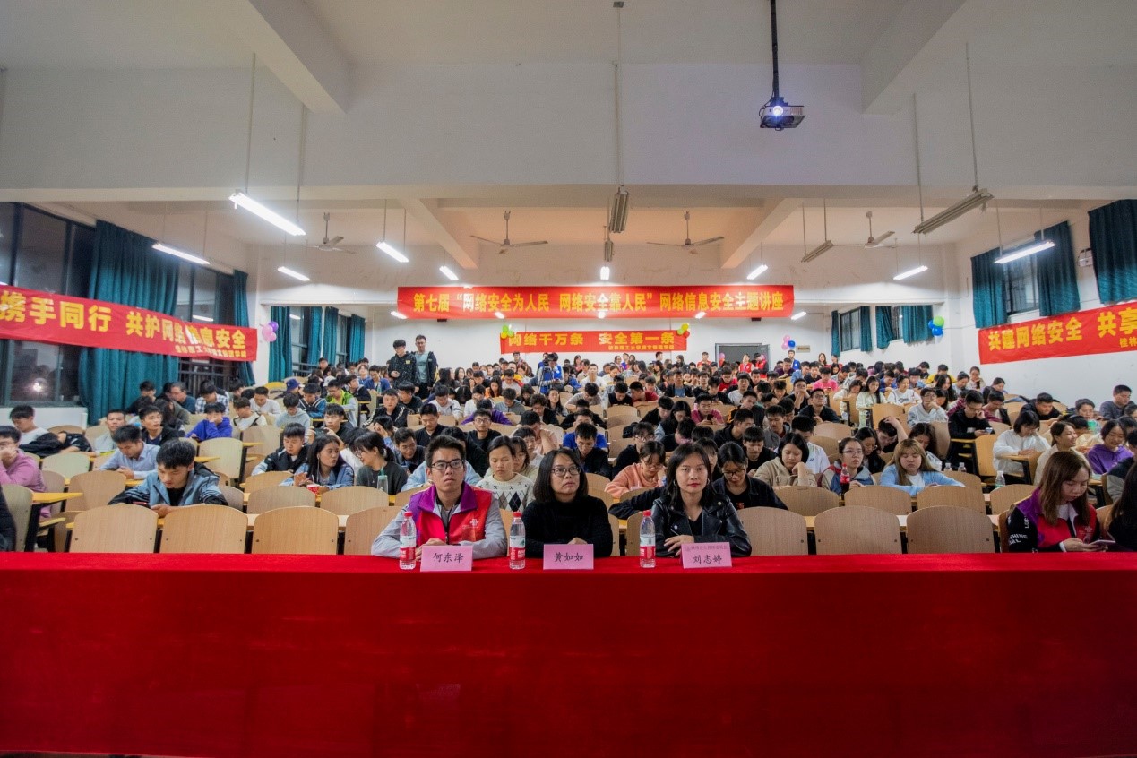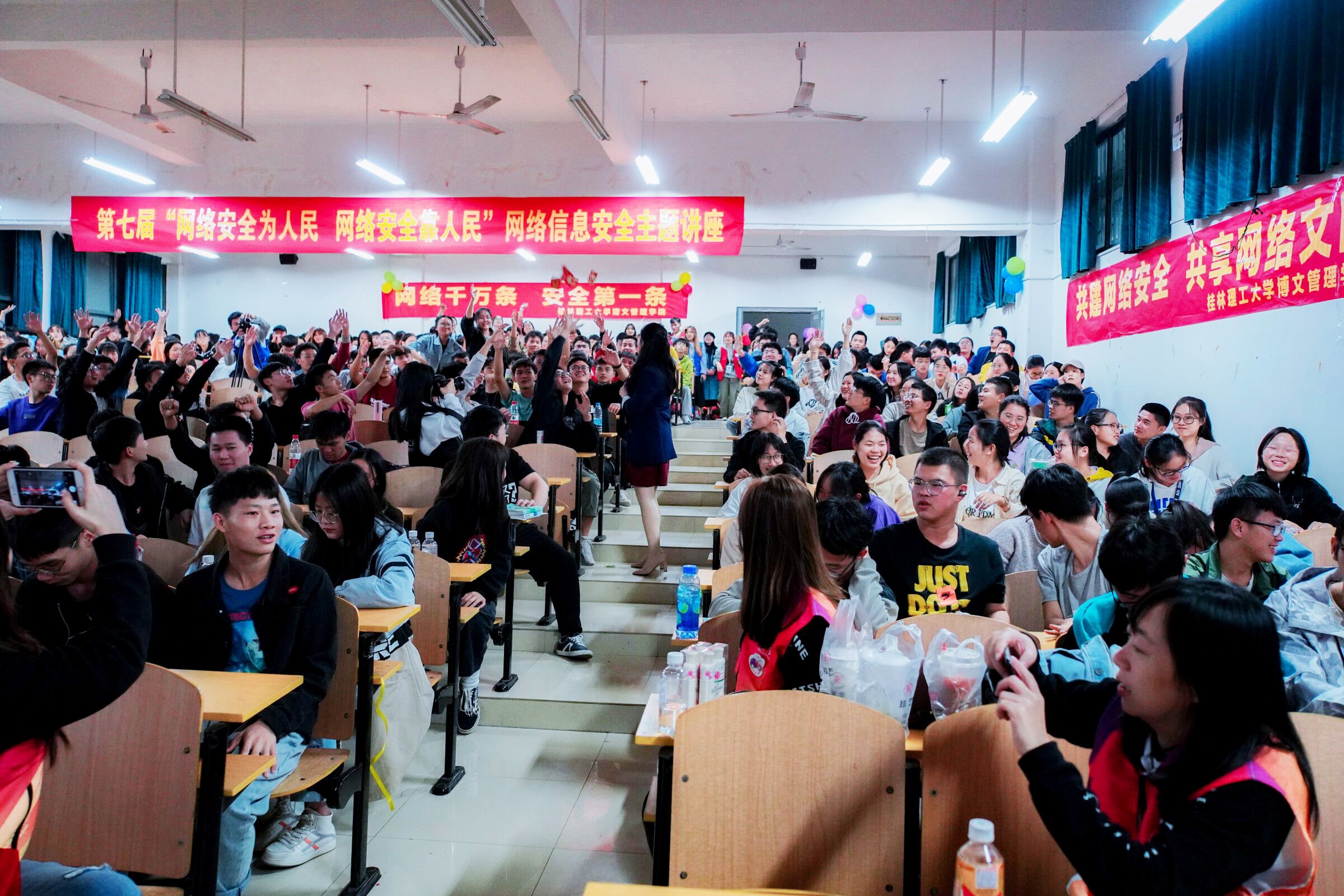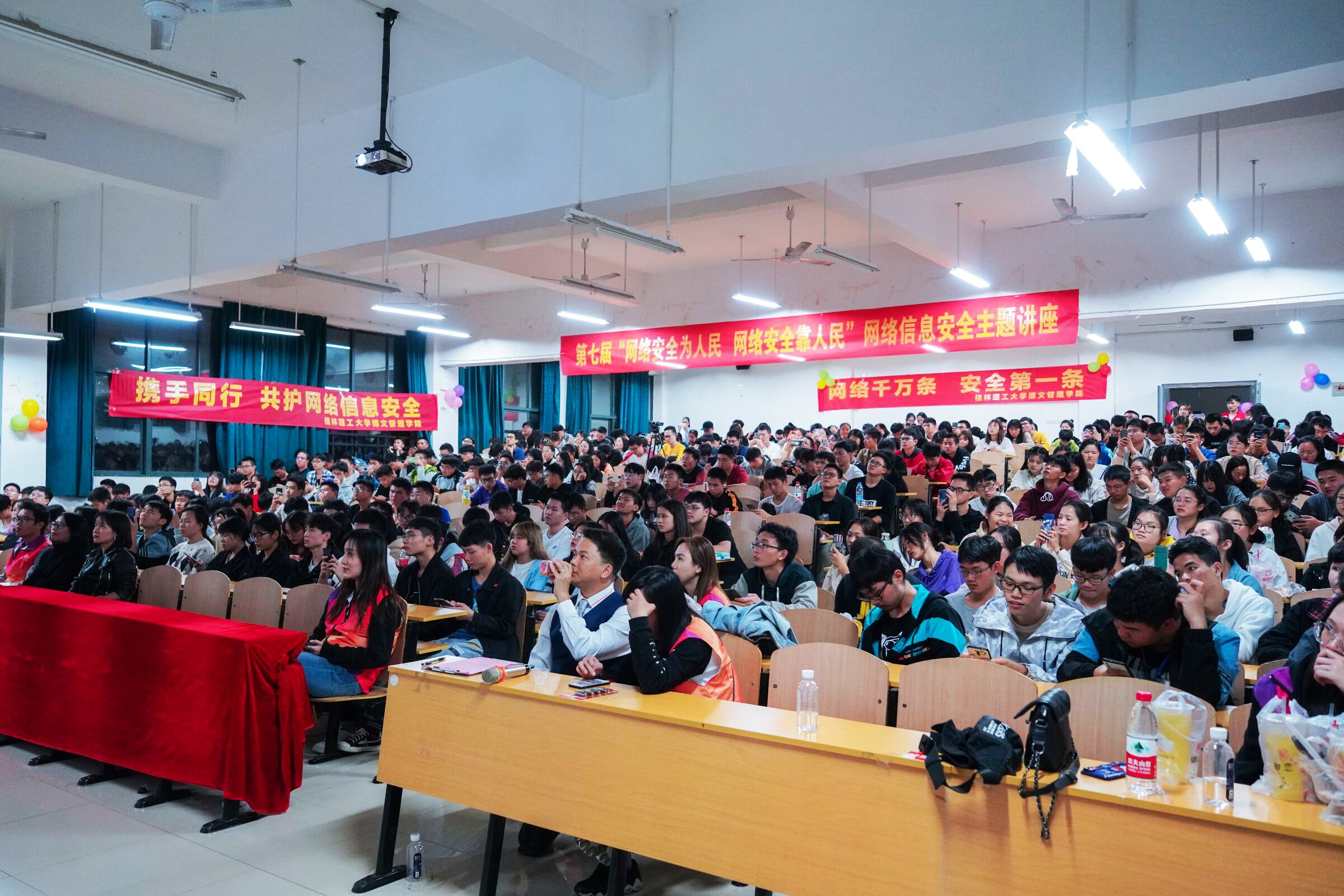 为积极响应2020年“国家网络安全宣传周”活动,增强全体师生网络安全防范意识,提高网络安全知识。10月22日晚,我校网络安全管理委员会、学生技术服务工作站于4栋4502教室联合举办了第七届“网络安全为人民,网络安全靠人民”主题讲座。本次讲座特邀中国联通校园分公司“小象”讲师、网络安全专家李瑞捷主讲,中国联通桂林市分公司客户服务部总经理黄如如、校园经理何东泽、图文信息中心老师以及全校约400名师生到场聆听此次讲座。